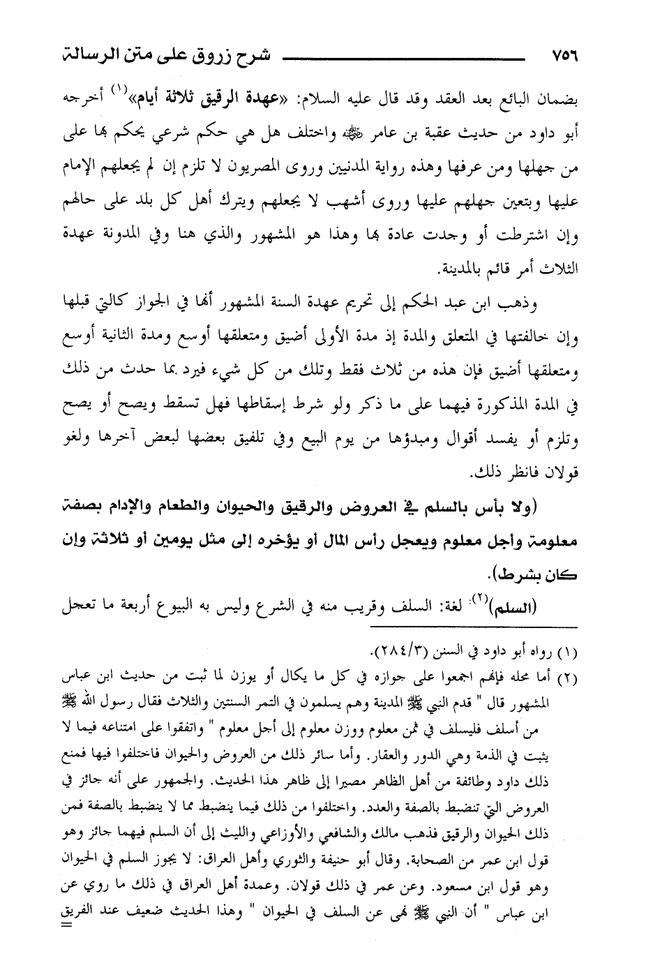 بضمان البائع بعد العقد وقد قال عليه السلام: " عهدة الرقيق ثلاثة أيام" أخرجه أبو داود من حديث عقبة بن عامر رضي الله عنه واختلف هل هي حكم شرعي يحكم بها على من جهلها ومن عرفها وهذه رواية المدنيين وروى المصريون لا تلزم إن لم يجعلهم الإمام عليها وبتعين جهلهم عليها ورى أشهب لا يجعلهم ويترك أهل كل بلد على حالهم وإن اشترطت أو وجدت عادة بها وهذا هو المشهور والذي هنا وفي المدونة عهدة الثلاث أمر قائم بالمدينة.