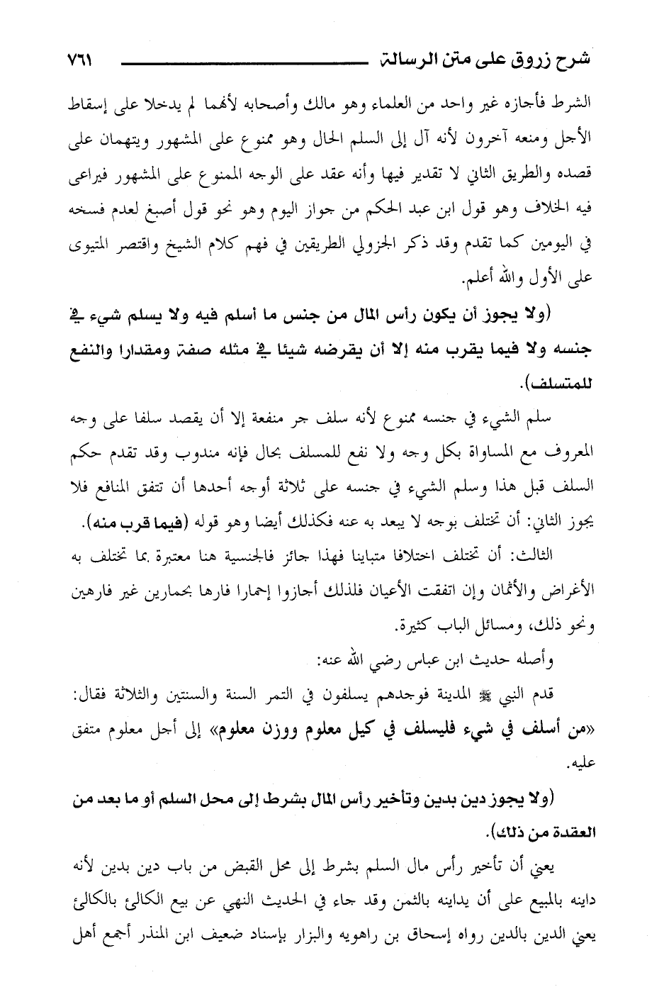 (ولا يجوز أن يكون رأس المال من جنس ما أسلم فيه ولا يسلم شيء في جنسه ولا فيما يقرب منه إلا أن يقرضه شيئا في مثله صفة ومقدارا والنفع للمستلف).