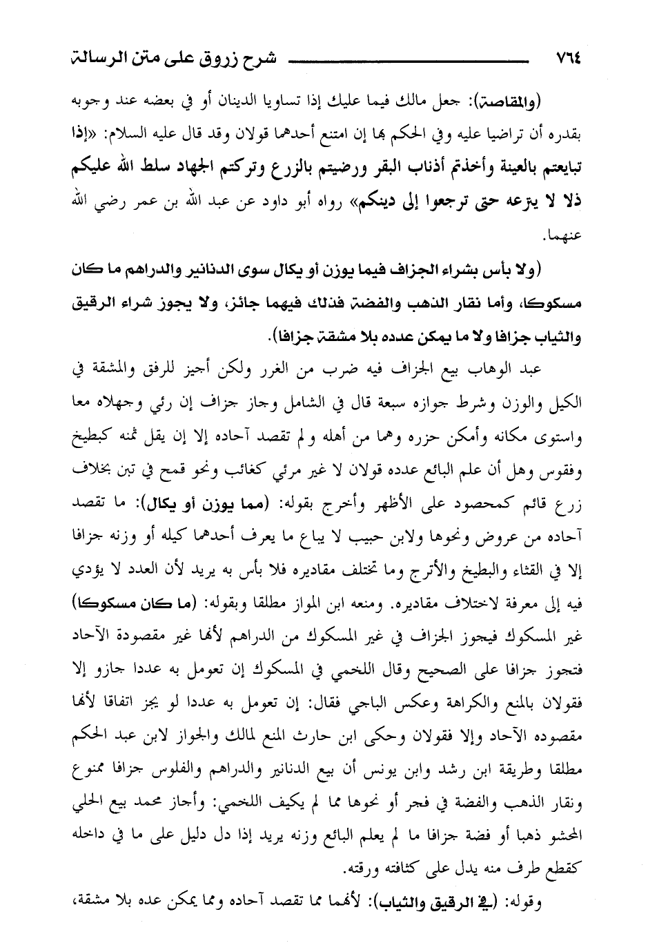 عبد الوهاب بيع الجزاف فيه ضرب من الغرر ولكن أجيز للرفق والمشقة في الكيل والوزن وشرط جوازه سبعة قال في الشامل وجاز جزاف إن رئي وجهلاه معا واستوى مكانه وأمكن حرزه وهما من أهله ولم تقصد آحاده إلا أن يقل ثمنه كبطيخ وفقوس وهل أن علم البائع عدده قولان لا غير مرئي كغائب ونحو قمح في تبن بخلاف زرع قائم كمحصود على الأظهر وأخرج بقوله: (مما يوزن أو يكال): ما تقصد آحاده من عروض ونحوها ولابن حبيب لا يباع ما يعرف أحدهما كيله أو وزنه جزافا إلا في القثاء والبطيخ والأترج وما تختلف مقاديره فلا بأس به يريد لأن العدد لا يؤدي فيه إلى معرفة لاختلاف مقاديره. ومنعه ابن المواز مطلقا وبقوله: (ما كان مسكوكا) غير المسكوك فيجوز الجزاف في غير المسكوك من الدراهم لأنها غير مقصودة الآحاد فتجوز جزافا على الصحيح وقال اللخمي في المسكوك إن تعومل به عددا جازو إلا فقولان بالمنع والكراهة وعكس الباجي فقال: إن تعومل به عددا لو يجز اتفاقا لأنها مقصودة الآحاد وإلا فقولان وحكى ابن حارث المنع لمالك والجواز لابن عبد الحكم مطلقا وطريقة ابن رشد وابن يونس أن بيع الدنانير والدراهم والفلوس جزافا ممنوع ونقار الذهب والفضة في فجر أو نحوها مما لم يكيف اللخمي: وأجاز محمد بيع الحلي المحشو ذهبا أو فضة جزافا ما لم يعلم البائع وزنه يريد إذا دل دليل على ما في داخله كقطع طرف منه يدل على كثافته ورقته.