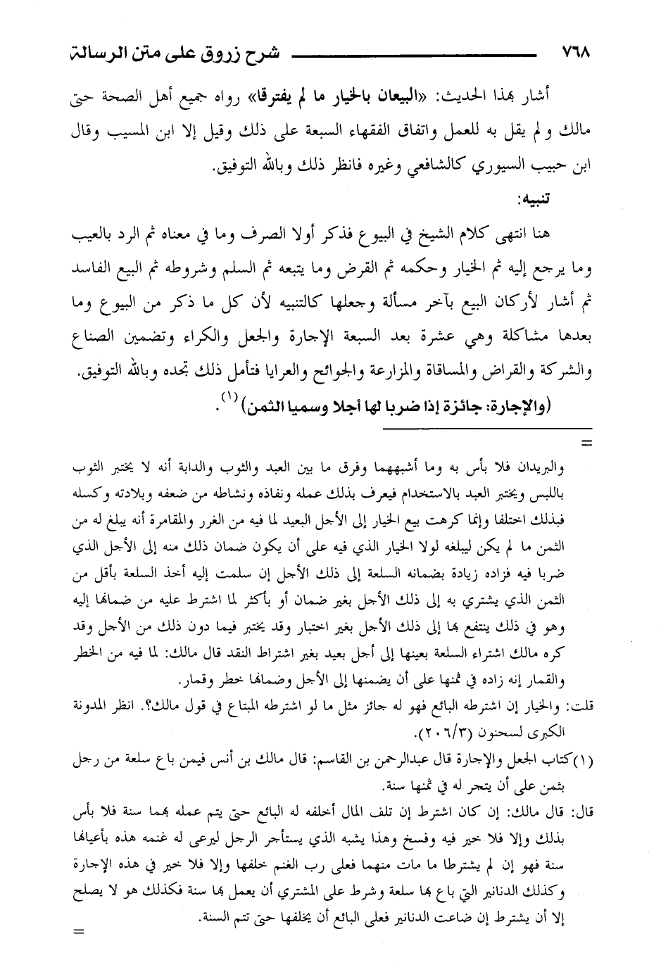 هنا انتهى كلام الشيخ في البيوع فذكر أولا الصرف وما في معناه ثم الرد بالعيب وما يرجع إليه ثم الخيار وحكمه ثم القرض وما يتبعه ثم السلم وشروطه ثم البيع الفاسد ثم أشار لأركان البيع بآخر مسألة وجعلها كالتنبيه لأن كل ما ذكر من البيوع وما بعدها مشاكلة وهي عشرة بعد السبعة الإجارة والجعل والكراء وتضمين الصناع والشركة والقراض والمساقاة والمزارعة والجوائح والعرايا فتأمل ذلك تجده وبالله التوفيق.