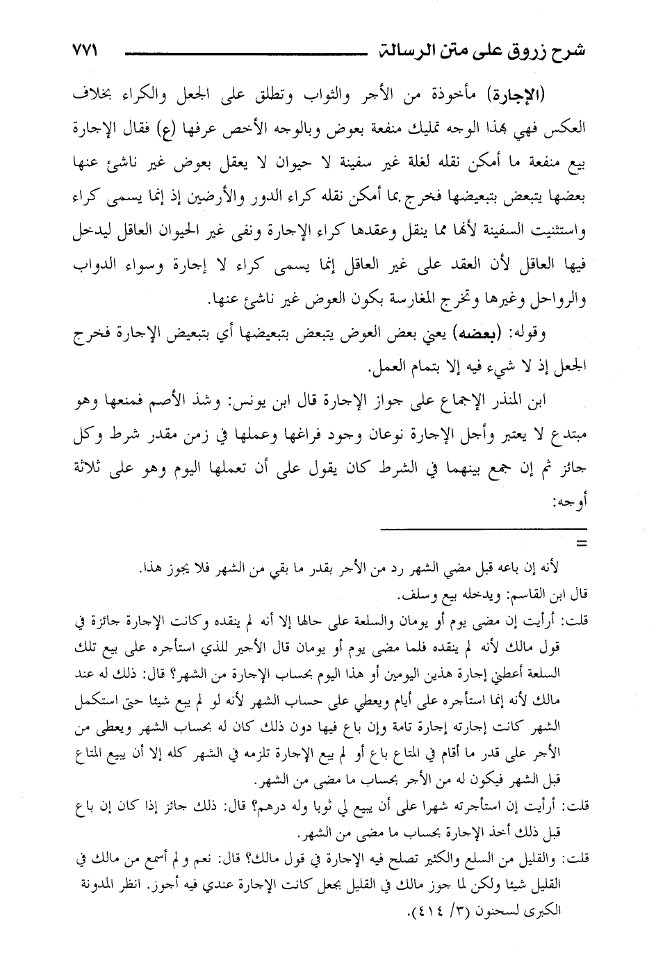 (الإجارة) مأخوذة من الأجر والثواب وتطلق على الجعل والكراء بخلاف العكس فهي بهذا الوجه تمليك منفعة بعوض وبالوجه الأخص عرفها (ع) فقال الإجارة بيع منفعة ما أمكن نقله لغلة غير سفينة لا يحوان لا يعقل بعوض غير ناشئ عنها بعضها يتبعض بتبعيضها فخرج بما أمكن نقله كراء الدور والأرضين إذ إنما يسمى كراء واستثنيت السفينة لأنها مما ينقل وعقدها كراء الإجارة ونفى غير الحيوان العاقل ليدخل فيها العاقل لأن العقد على غير العاقل إنما يسمى كراء لا إجارة وسواء الدواب والرواحل وغيرها وتخرج المغارسة بكون العوض غير ناشئ عنها.