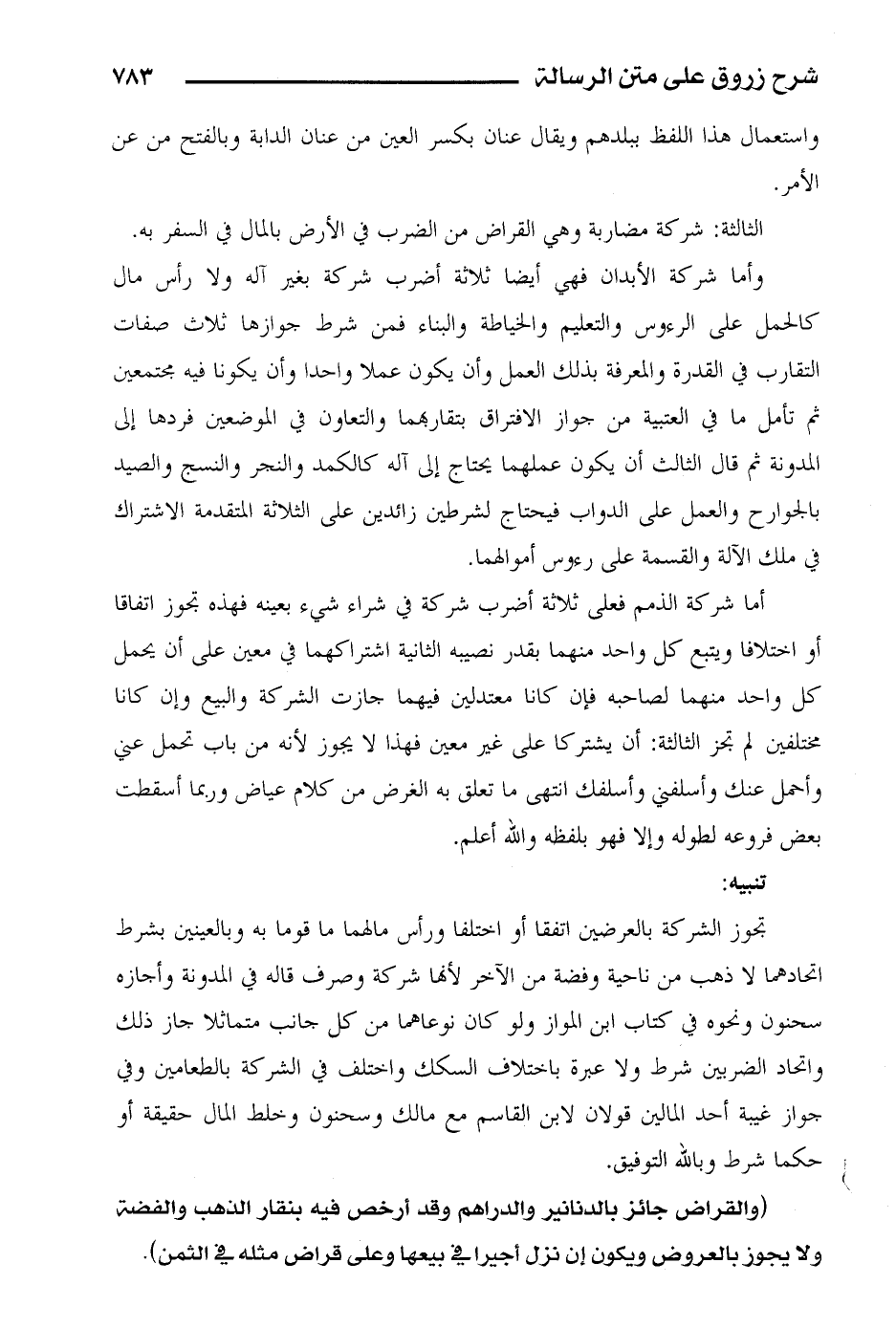أما شركة الذمم فعلى ثلاثة أضرب شركة في شراء شيء بعينه فهذه تجوز اتفاقا أو اختلافا ويتبع كل واحد منهما بقدر نصيبه الثانية اشتراكهما في معين على أن يحمل كل واحد منهما لصاحبه فإن كانا معتدلين فيهما جازت الشركة والبيع وإن كانا مختلفين لم تجز الثالثة: أن يشتركا على غير معين فهذا لا يجوز لأنه من باب تحمل عني وأحمل عنك وأسلفني وأسلفك انتهى ما تعلق به الغرض من كلام عياض وربما أسقطت بعض فروعه لطوله وإلا فهو بلفظه والله أعلم.