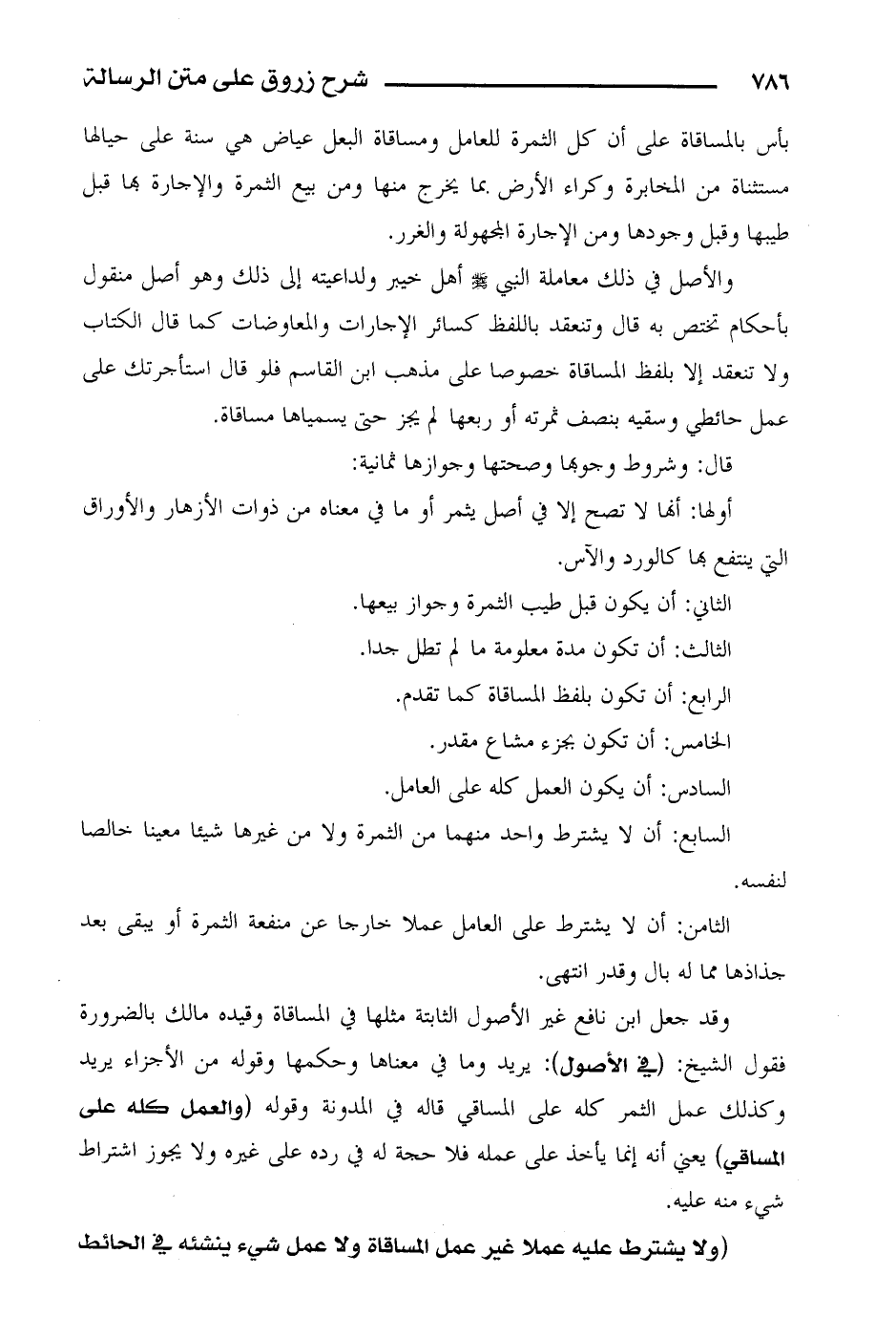 وقد جعل ابن نافع غير الأصول الثابتة مثلها في المساقاة وقيده مالك بالضرورة فقول الشيخ: (في الأصول): يريد وما في معناها وحكمها وقوله من الأجزاء يريد وكذلك عمل الثمر كله على المساقي قاله في المدونة وقوله (والعمل كله على المساقي) يعني أنه إنما يأخذ على عمله فلا حجة له في رده على غيره ولا يجوز اشتراط شيء منه عليه.