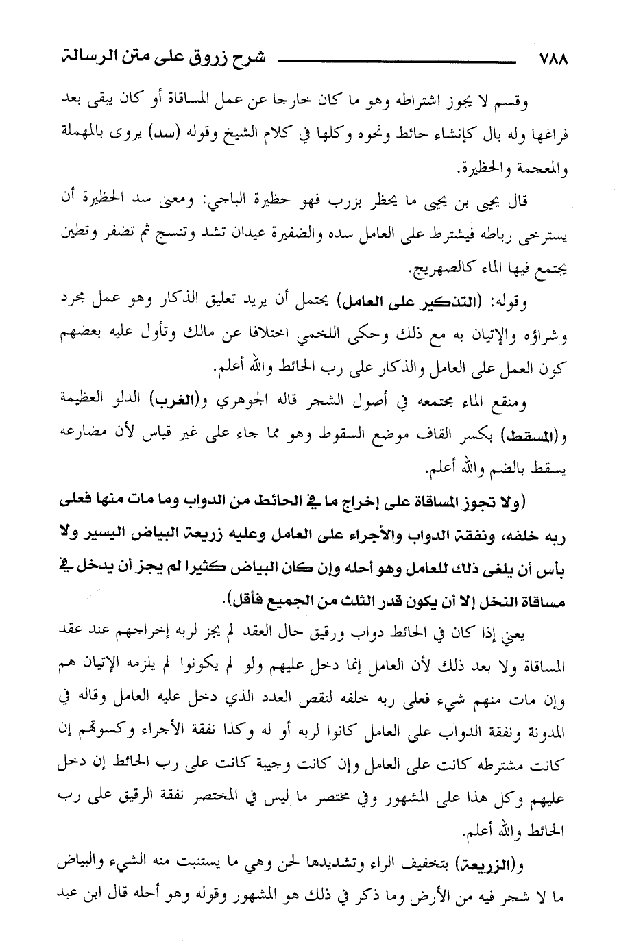 (ولا تجوز المساقاة على إخراج ما في الحائط من الدواب وما مات منها فعلى ربه خلفه، ونفقة الدواب والأجراء على العامل وعليه زريعة البياض اليسير ولا بأس أن يلغى ذلك للعامل وهو أحله وإن كان البياض كثرا لم يجز أن يدخله في مساقاة النخل إلا أن يكون قدر الثلث من الجميع فأقل).