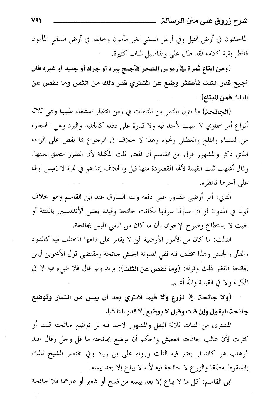 الثاني: أمر أرضى مقدور على دفعه ومنه السارق عند ابن القاسم وهو خلاف قوله في المدونة لو أن سارقا سرقها لكانت جائحة وقيده بعض الأندلسين بالفتنة أو حيث لا يستطاع وصرح الإخوان بأن ما كان من آدمي فليس بجائحة.
