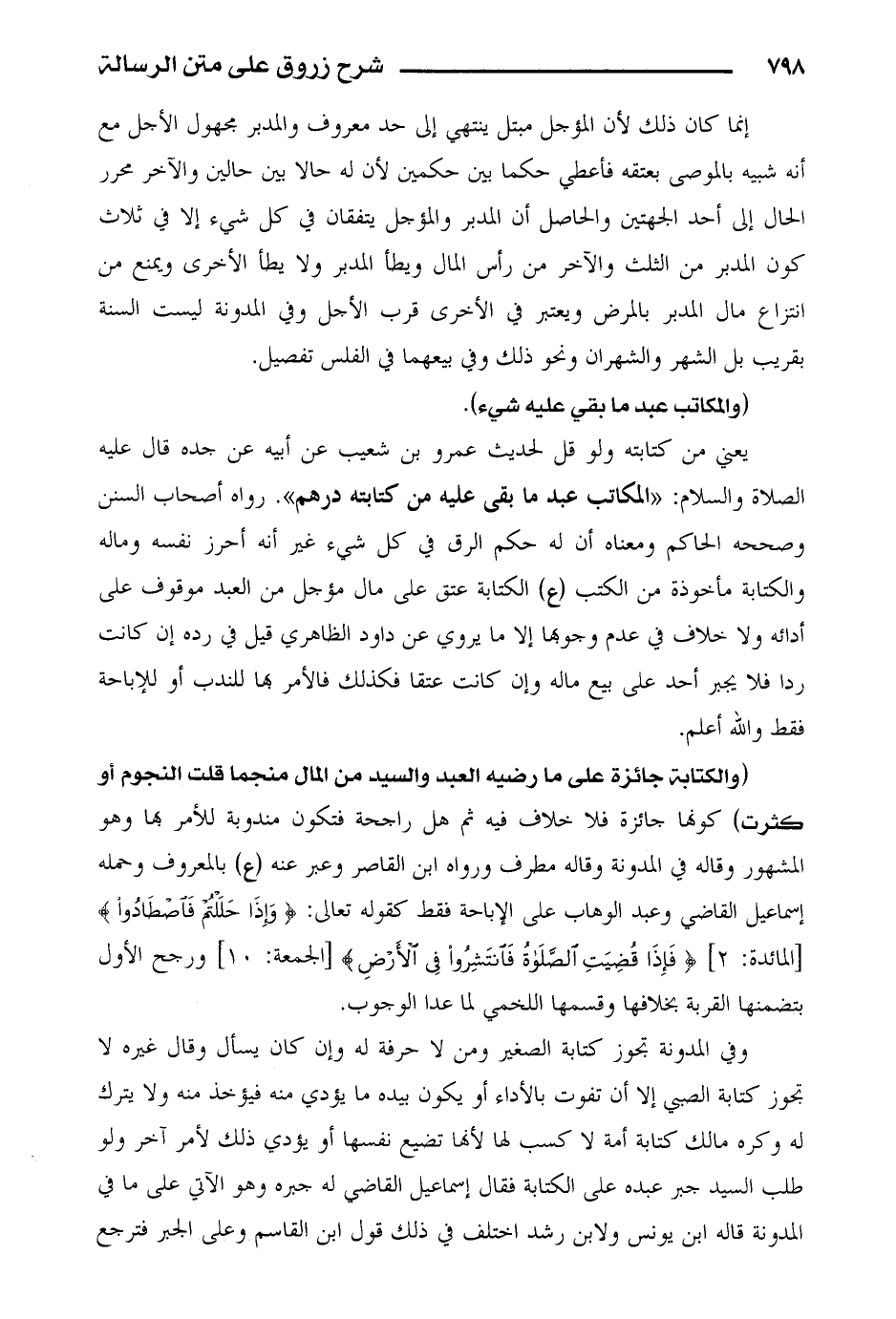 (والكتابة جائزة على ما رضيه العبد والسيد من المال منجما قلت النجوم أو كثرت) كونها جائزة فلا خلاف فيه ثم هل راجحة فتكون مندوبة للأمر بها وهو المشهور وقاله في المدونة وقال مطرف ورواه ابن القاصر وعبر عنه (ع) بالمعروف وحمله إسماعيل القاضي وعبد الوهاب على الإباحة فقط كقوله تعالى: {وإذا حللتم فاصطادوا} [المائدة: 2] {فإذا قضيت الصلاة فانتشروا في الأرض} [الجمعة: 10] ورجح الأول بتضمنها القربة بخلافها وقسمها اللخمي لما عدا الوجوب.