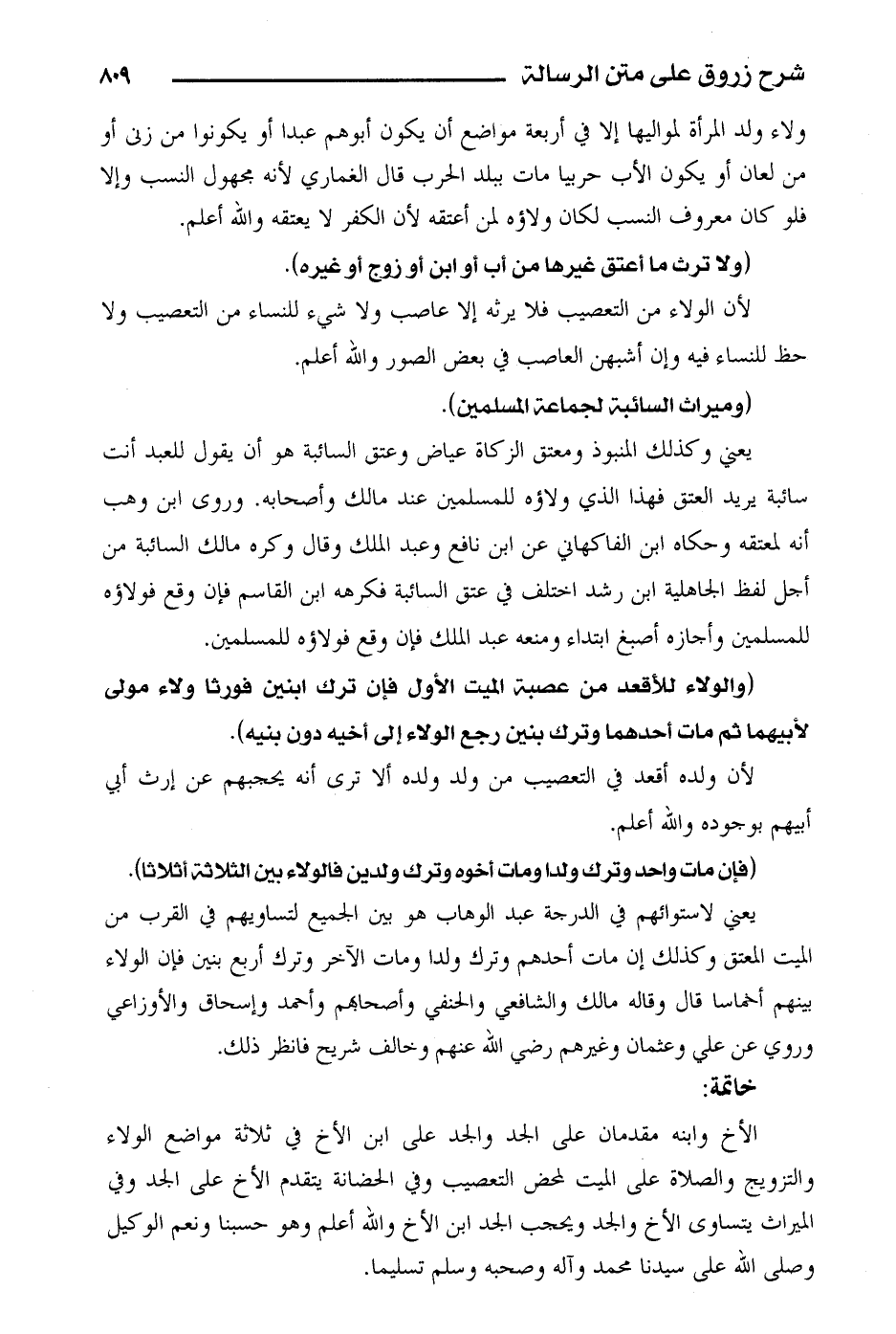 الأخ وابنه مقدمان على الجد والجد على ابن الأخ في ثلاثة مواضع الولاء والتزويج والصلاة على الميت لمحض التعصيب وفي الحضانة بتقديم الأخ على الجد وفي الميراث يتساوى الأخ والجد ويحجب الجد ابن الأخ والله أعلم وهو حسبنا ونعم الوكيل وصلى الله على سيدنا محمد وآله وصحبه وسلم تسليما.