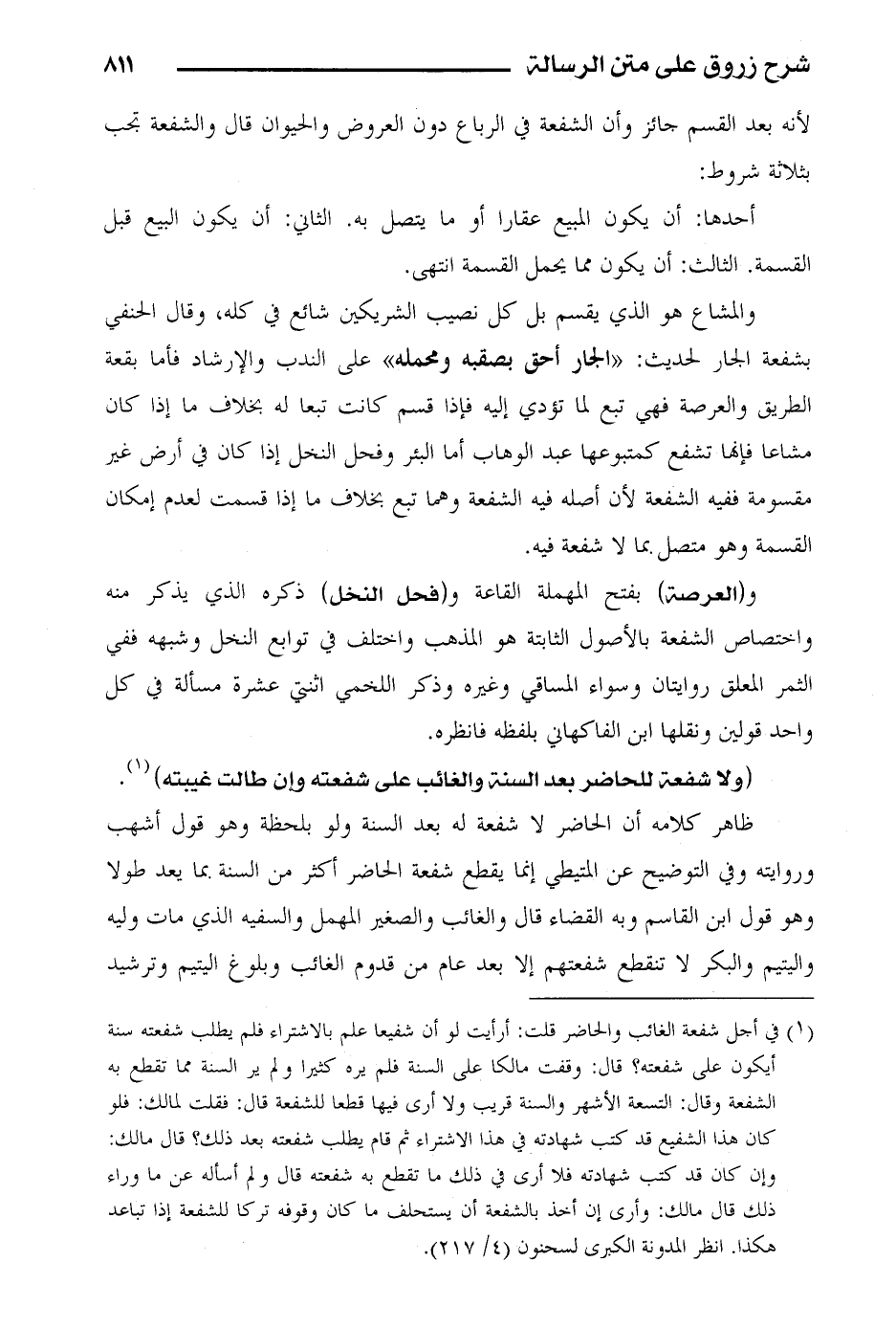 والمشاع هو الذي يقسم بل كل نصيب الشريكين شائع في كله، وقال الحنفي بشفعة الجار لحديث: " الجار أحق بصقبة ومحمله" على الندب والإرشاد فأما بقعة الطريق والرصة فهي تبع لما تؤدي إليه فإذا قسم كانت تبعا له بخلاف ما إذا كان مشاعا فإنها تشفع كمتبوعها عبد الوهاب أما البئر وفحل النخل إذا كان في أرض غير مقسمومة ففيه الشفعة لأن أصله فيه الشفعة وهما تبع بخلاف ما إذا قسمت لعدم إمكان القسمة هو متصل بما لا شفعة فيه.