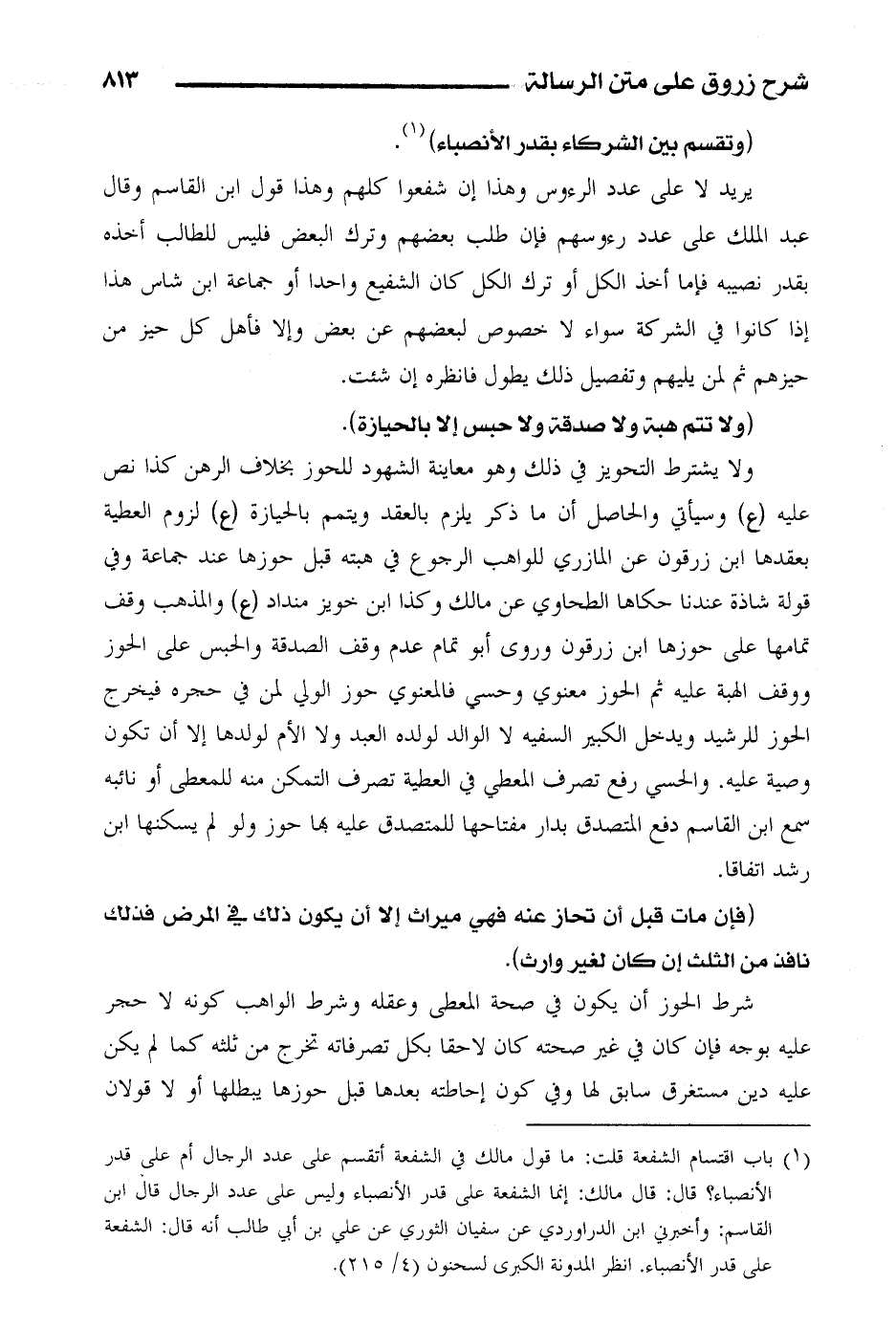 يريد لا على عدد الرءوس وهذا إن شفعوا كلهم وهذا قول ابن القاسم وقال عبد الملك على عدد رءوسهم فإن طلب بعضهم وترك البعض فليس للطالب أخذه بقدر نصيبه فإما أخذ الكل أو ترك الكل كان الشفيع واحدا أو جماعة ابن شاس هذا إذا كانوا في الشركة سواء لا خصوص لبعضهم عن بعض وإلا فأهل كل حيز من حيزهم ثم لمن يليهم وتفصيل ذلك يطول فانظره إن شئت.