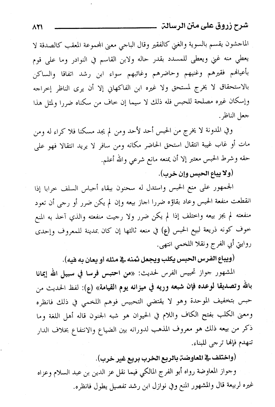 الجمهور على منع الحبس واستدل له سحنون ببقاء أحباس السلف خرابا إذا انقطعت منفعة الحبس وعاد بقاؤه ضررا أجاز بيعه وإن لم يكن ضرر أو رجى أن تعود منفعته لم يجز بيعه واختلف إذا لم يكن ضرر ولا رجيت منفعته والذي آخذ به المنع خوف كونه ذريعة لبيع الحبس (ع) في منعه ثالثها إن كان بمدينة للمعروف وإحدى روايتي أبي الفرج ونقلا اللخمي انتهى.