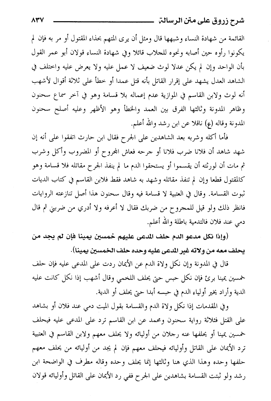 وفي المقدمات إذا نكل ولاة الدم والقسامة بقول الميت دمي عند فلان أو بشاهد على القتل فثلاثة رواية سحنون ومحمد عن ابن القاسم ترد على المدعى عليه فيحلف خمسين يمينا أو يحلفها عنه رجلان من أوليائه ولا يحلف معهم ولابن القاسم في العتبية ترد الأيمان على القتال وأوليائه فيحلف معهم فإن لم يجد من أوليائه من يحلف معهم حلفها وحده وهذا الذي هنا وثالثها إنما يحلف وحده وقال مطرف في الواضحة ابن رشد ولو ثبتت القسامة بشاهدين على الجرح ففي رد الأيمان على القاتل وأوليائه قولان