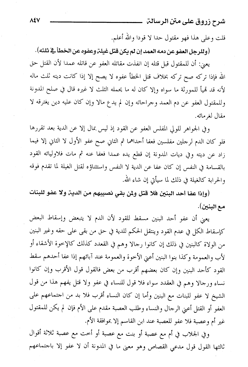 يعني أن عفو أحد البنين مسقط للقود لأن الدم لا يتبعض وإسقاط البعض كإسقاط الكل في عدم القود وينتقل الحكم للدية في حق من بقى على حقه وغير البنين من الولاة كالبنين في ذلك إن كانوا رجالا وهم في القعدد كذلك كالإخوة الأشقياء أو لأب والعمومة وكذا بنوا النبين أعني الأخوة والعمومة عند آبائهم إذا عفا أحدهم سقط القود كأحد البنين وإن كان بعضهم أقرب من بعض فالقول قول الأقرب وإن كانوا نساء ورجالا وهم في العقدد سواء فلا قول للنساء في عفو ولا قتل يفهم هذا من قول الشيخ لا عفو للبنات مع البنين وأما إن كان النساء أقرب فلا بد من اجتماعهم على العفو أو القتل أعني الرجال والنساء وطلب العصبة مقدم على الأم فإن لم يكن للمقتول غير أم وعصبة فلا عفو للعصبة عند ابن القاسم إلا بالموافقة الأم.