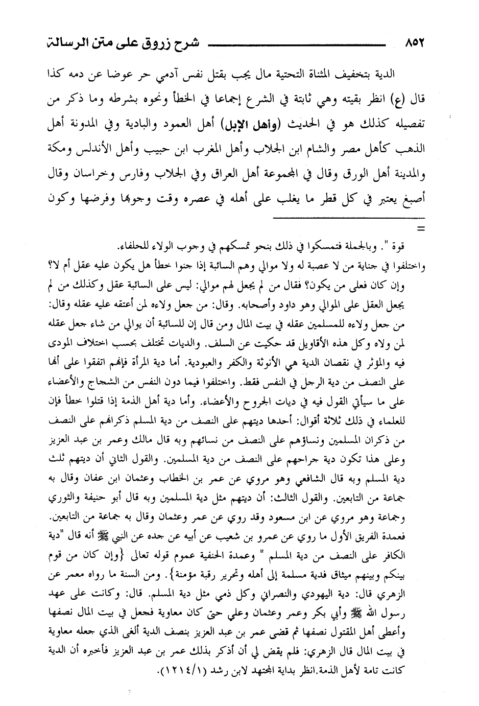 الدية بتخفيف المثناة التحتية مال يجب بقتل نفس آدمي حر وعوضا عن دمه كذا قال (ع) انظر بقيته وهي ثابتة في الشرع إجماعا في الخطأ ونحوه بشرط وما ذكر من فتصيله كذلك هو في الحديث (وأهل الإبل) أهل العمود والبادية وفي المدونة أهل الذهب كأهل مصر والشام ابن الجلاب وأهل المغرب ابن حبيب وأهل الأندلس ومكة والمدينة أهل الورق وقال في المجموعة أهل العراق وفي الجلاب وفارس وخراسان وقال أصبغ يعتبر في كل قطر ما يغلب على أهله في عصره وقت وجوبها وفرضها وكون