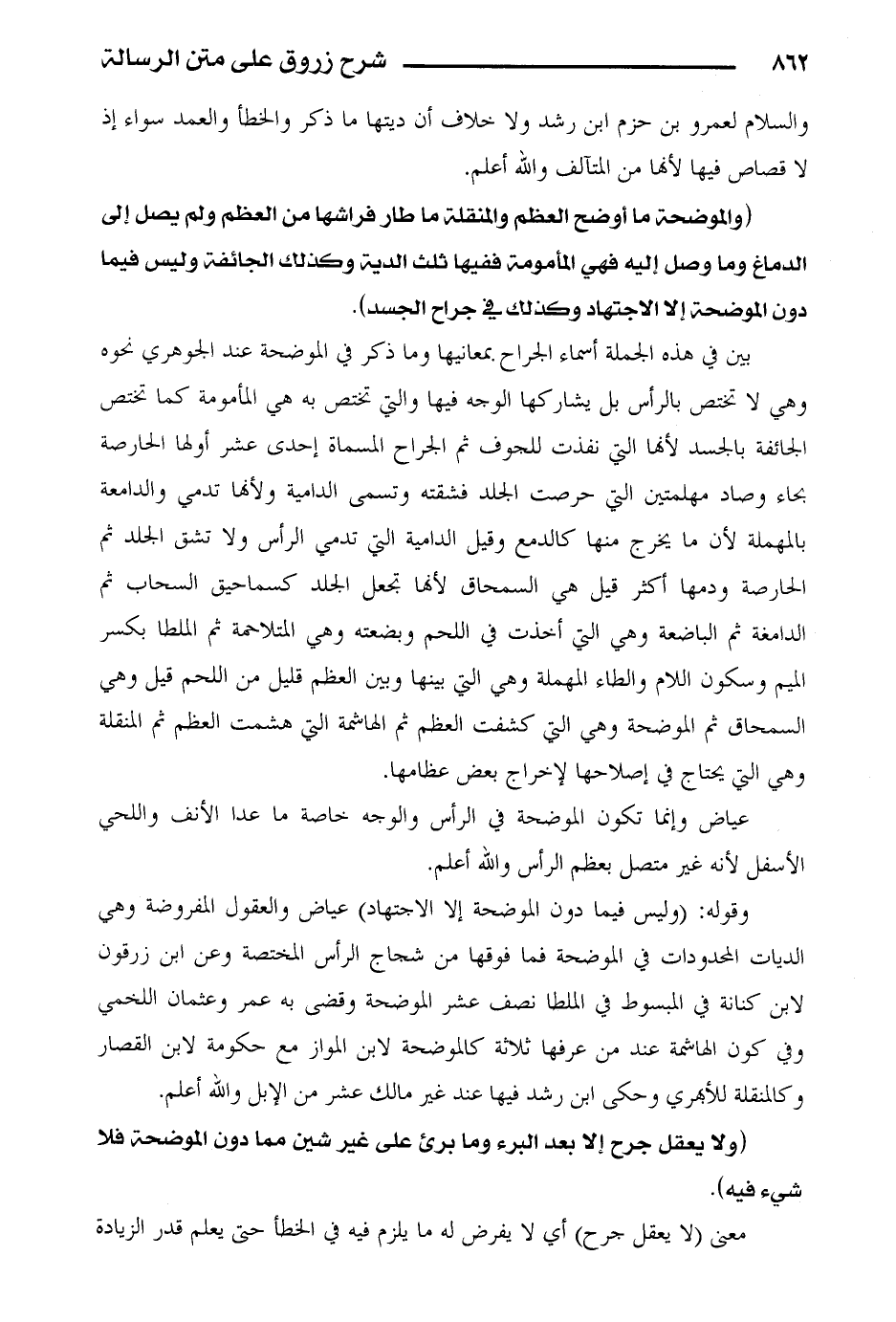 عياض وإنما تكون الموضحة في الرأس والوجه خاصة ما عدا الأنف واللحي الأسفل لأنه غير متصل بعظم الرأس والله أعلم.