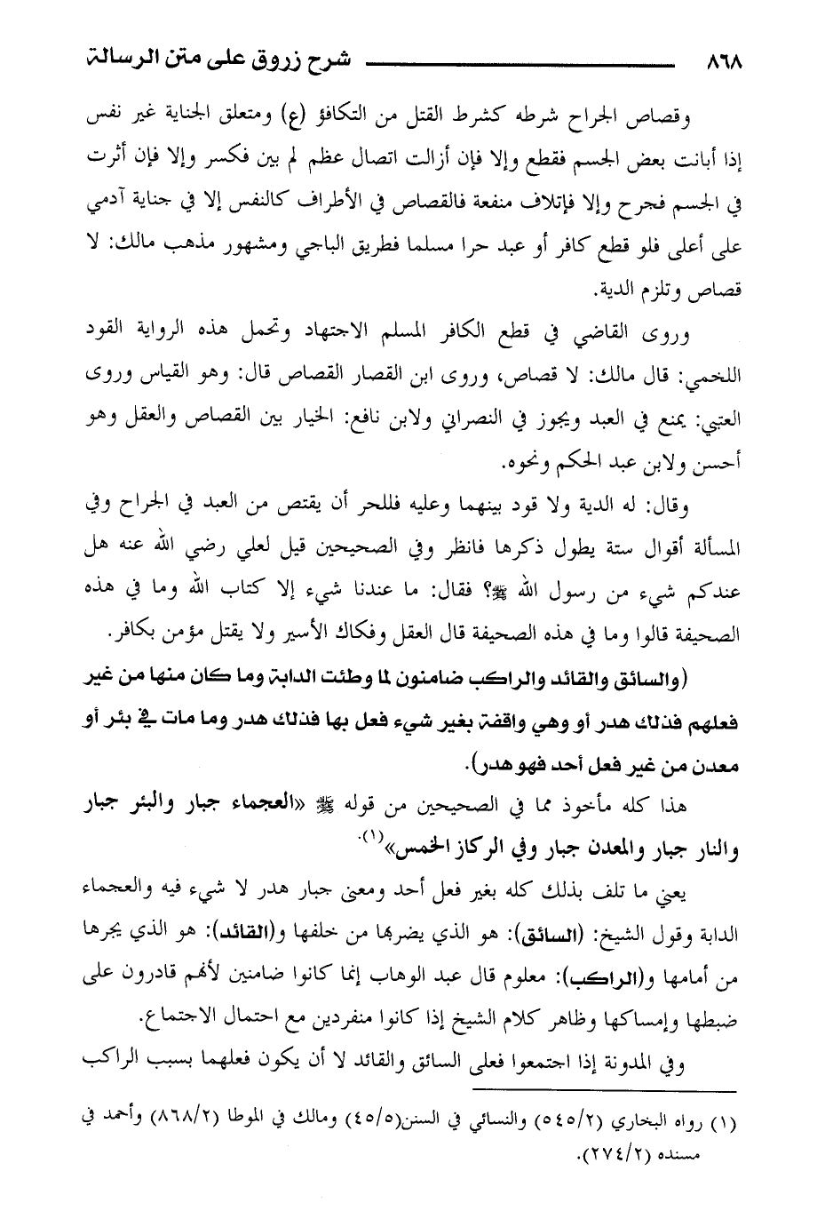 يعني ما تلف بذلك كله بغير فعل أحد ومعنى جبار هدر لا شيء فيه والعجماء الدابة وقول الشيخ: (السائق): هو الذي يضربها من خلفها و (القائد): هو الذي يجرها من أمامها و (الراكب): معلوم قال عبد الوهاب إنما كانوا ضامنين لأنهم قادرون على ضبطها وإمساكها وظاهر كلام الشيخ إذا كانوا منفردين مع احتمال الاجتماع.
