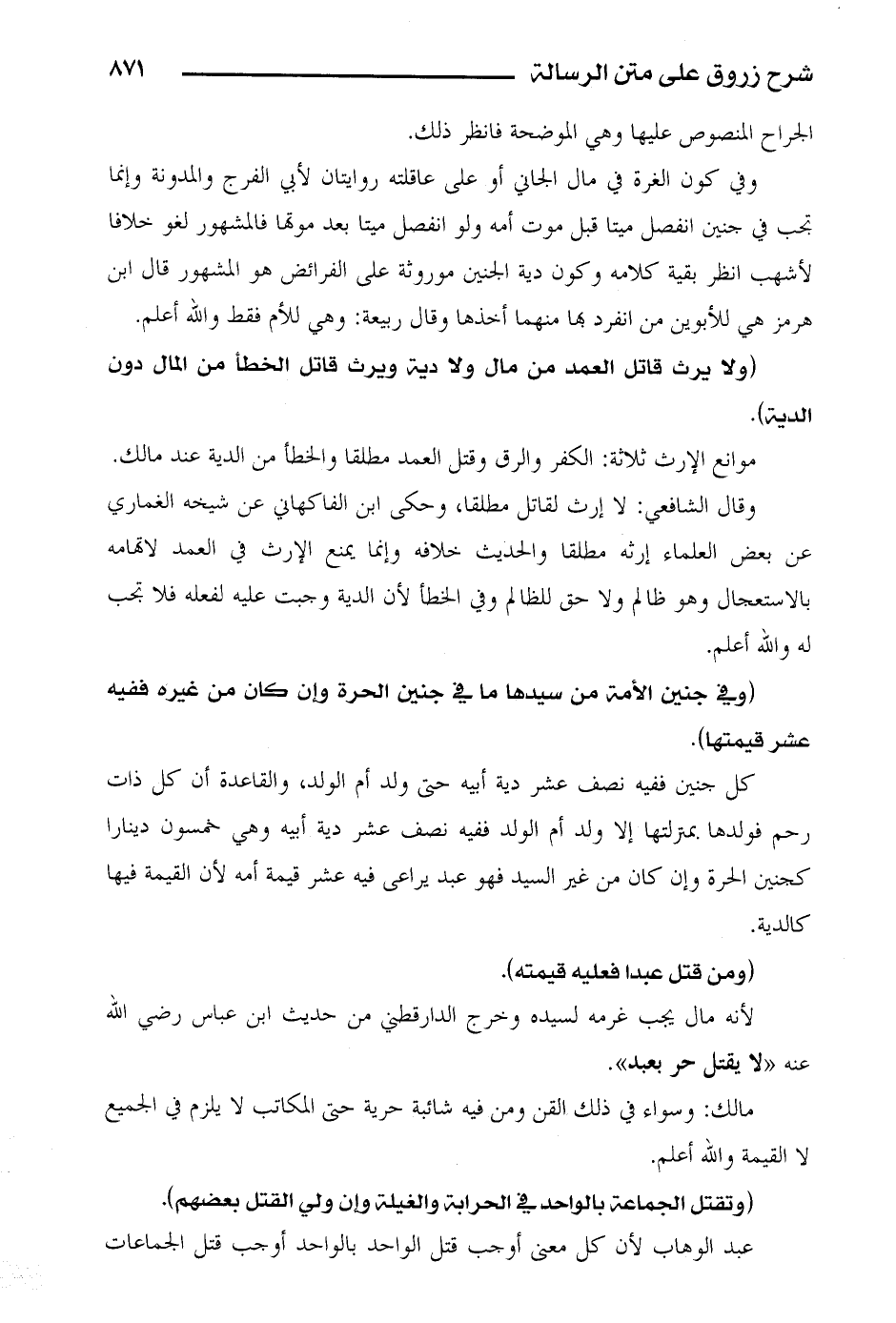 وقال الشافعي: لا إرث لقاتل مطلقا، وحكى ابن الفاكهاني عن شيخه الغماري عن بعض العلماء إرثه مطلقا والحديث خلافه وإنما يمنع الإرث في العمد لاتهامه بالاستعجال وهو ظالم ولا حق للظالم وفي الخطأ لأن الدية وجبت عليه لفعله فلا تجب له والله أعلم.