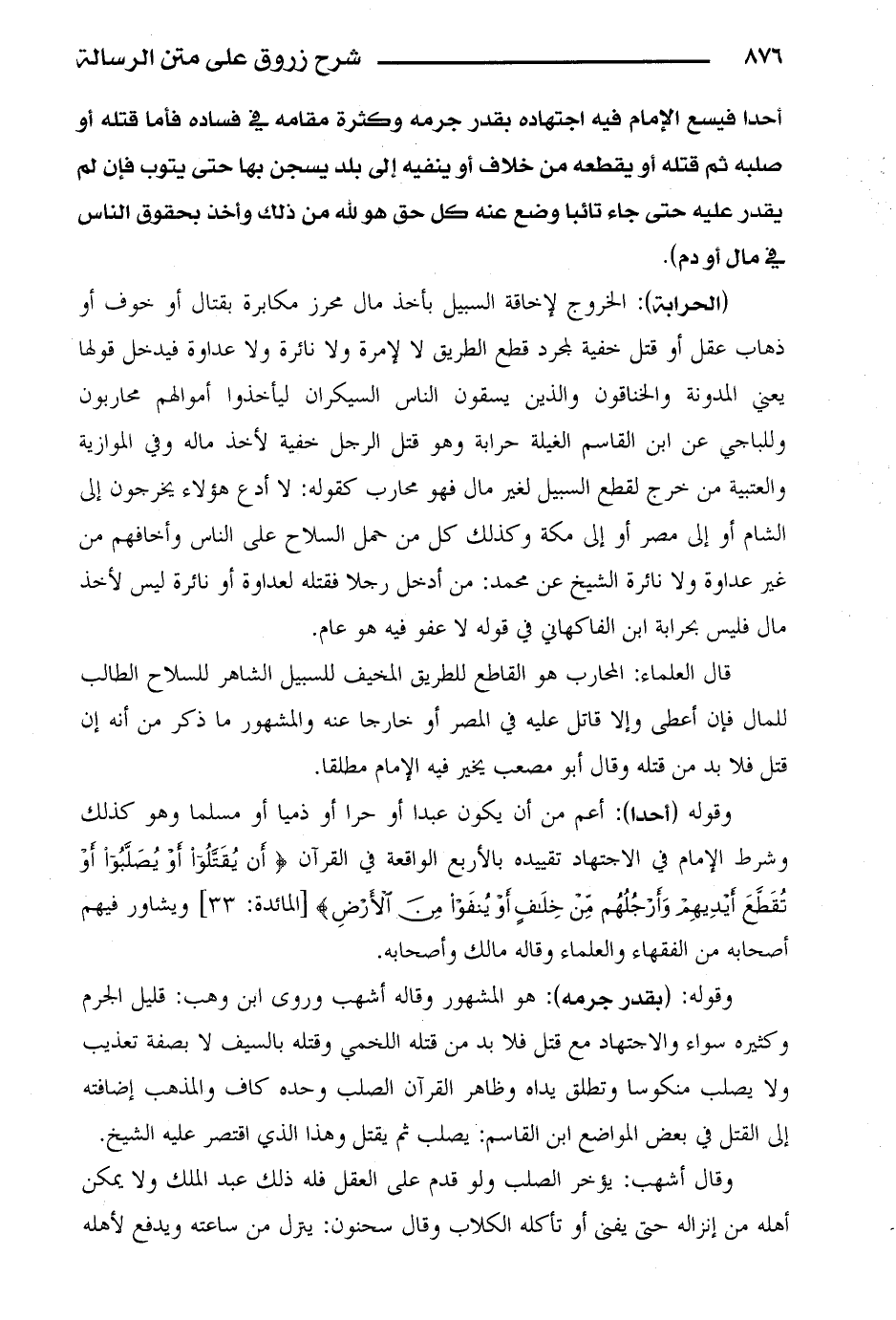 قال العلماء: المحارب هو القاطع للطريق المخيف للسبيل الشاهر للسلاح الطلاب للمال فإن أعطى وإلا قاتل عليه في المصر أو خارجا عنه والمشهور ما ذكر من أنه إن قتل فلا بد من قتله وقال أبو مصعب يخير فيه الإمام مطلقا.