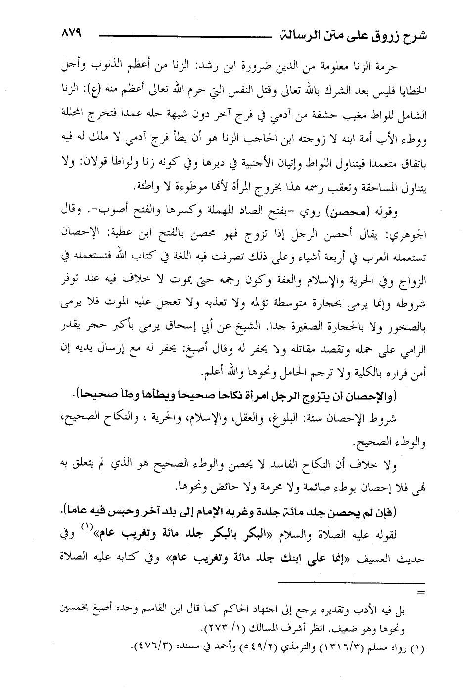حرمة الزنا معلومة من الدين ضرورة ابن رشد: الزنا من أعظم الذنوب وأجل الخطايا فليس بعد الشرك بالله تعالى وقتل النفس التي حرم الله تعالى أعظم منه (ع): الزنا الشامل للواط مغيب حشفة من آدمي في فرج آخر دون شبهة حله عمدا فتخرج المحللة ووطء الأب أمة ابنه لا زوجته ابن الحاجب الزنا هو أن يطأ فرج آدمي لا ملك له فيه باتفاق متعمدا فيتناول اللواط وإتيان الأجنبية في دبرها وفي كونه زنا ولواطا قولان: ولا يتناول المساحقة وتعقب رسمه هذا بخروج المرأة لأنها موطوءة لا واطئة.