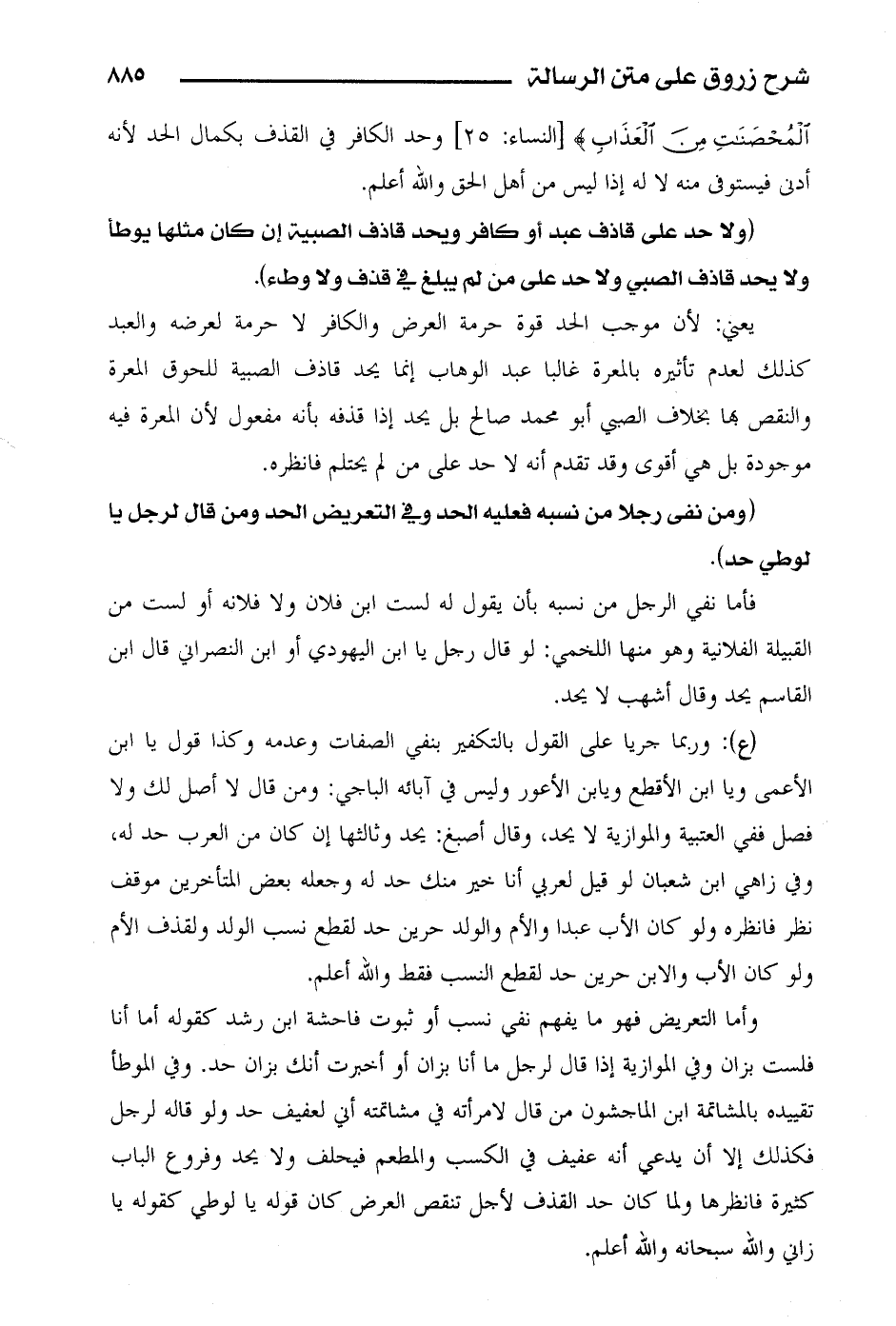 (ع): وربما جريا على القول بالتكفير بنفي الصفات وعدمه وكذا قول يا ابن الأعمى ويا ابن الأقطع ويا بن الأعور وليس في آبائه الباجي: ومن قال لا أصل لك ولا فصل ففي العتبية والموازية لا يحد، وقال أصبغ: يحد وثالثها إن كان من العرب حد له، وفي زاهي ابن شعبان لو قيل لعربي أنا خير منك حد له وجعله بعض المتأخرين موقف نظر فانظره ولو كان الأب عبدا والأم والولد حرين حد لقطع نسب الولد ولقذف الأم ولو كان الأبو الابن رين حد لقطع النسب فقط والله أعلم.
