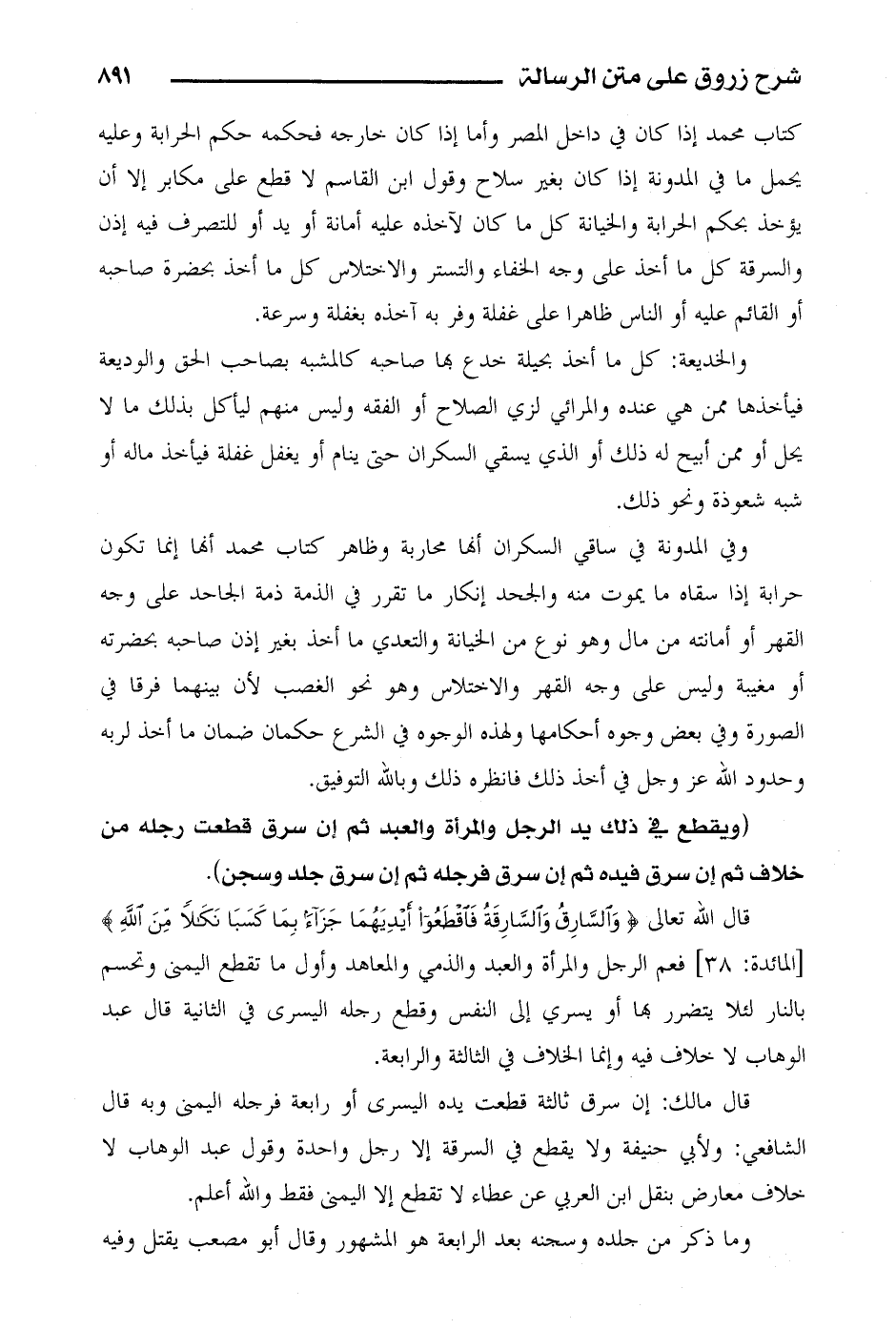 قال الله تعالى: {والسارق والسارقة فاقطعوا أيديهما جزاء بما كسبا نكالاً من الله} [المائدة: 38] فعم الرجل والمرأة والعبد والذمي والمعاهد وأول ما تقطع اليمنى وتحسم بالنار لئلاتضرر بها أو يسري إلى النفس وقطع رجله اليسرى في الثانية قال عبد الوهاب لا خلاف فيه وإنما الخلاف في الثالثة والرابعة.