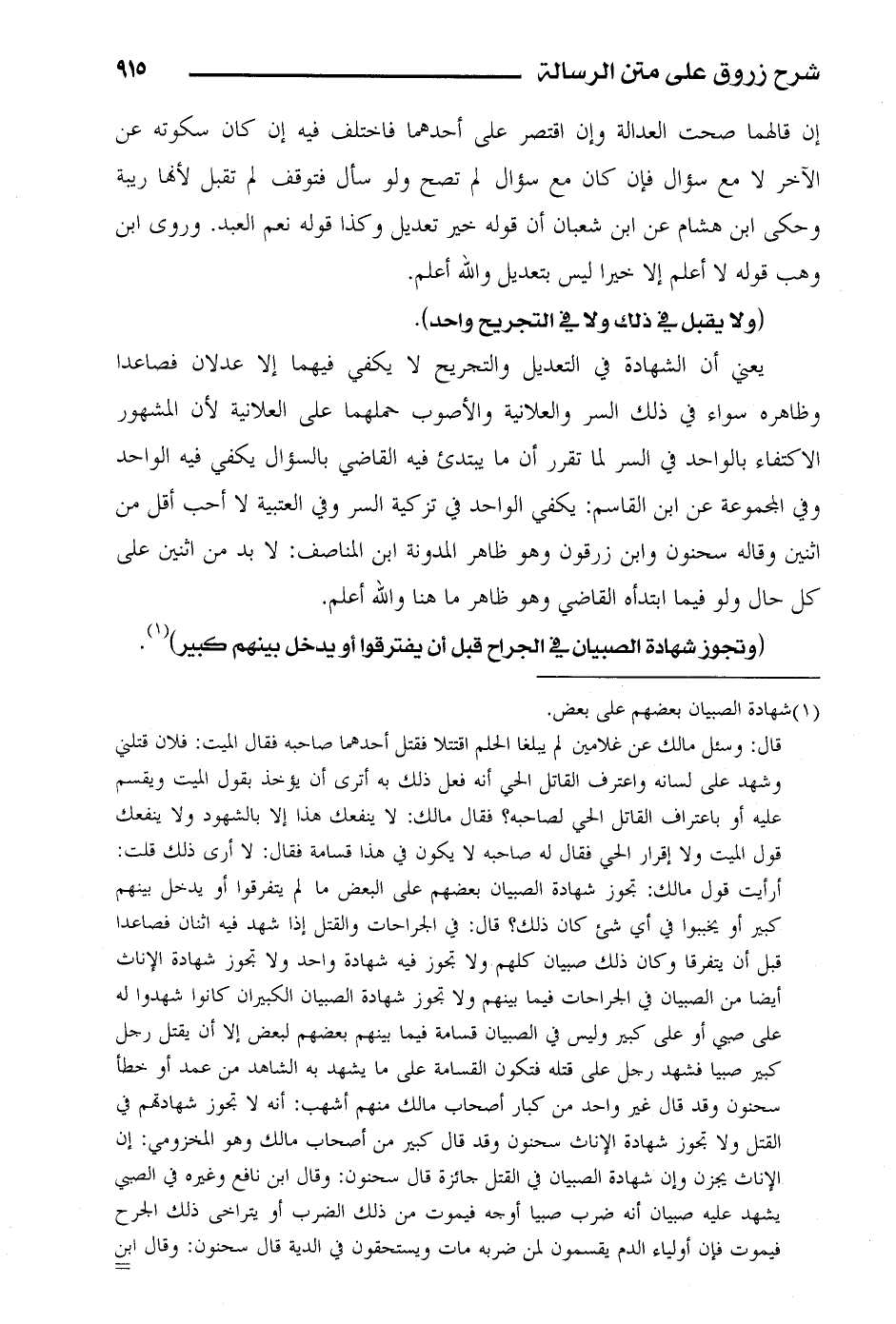يعني أن الشهادة في التعديل والتجريح لا يكفي فيهما إلا عدلان فصاعدا وظاهره سواء في ذلك السر والعلانية والأصوب حملهما على العلانية لأن المشهور الاكتفاء بالواحد في السر لما تقرر أن ما يبتدئ فيه القاضي بالسؤال يكفي فيه الواحد وفي المجموعة عن ابن القاسم: يكفي الواحد في تزكية السر وفي العتبية لا أحب أقل من اثنين وقال سحنون وابن زرقون وهو ظاهر المدونة ابن المناصف: لابد من اثنين على كل حال ولو فيما ابتدأه القاضي وهو ظاهر ما هنا والله أعلم.