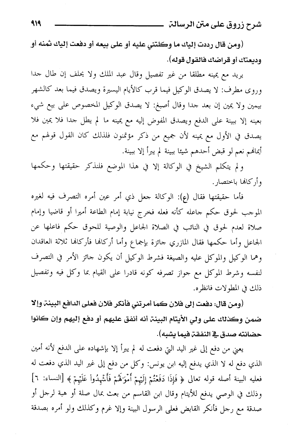 ولم يتكلم الشيخ في الوكالة إلا في هذا الموضع فلنذكر حقيقتها وحكمها وأركانها باختصار.