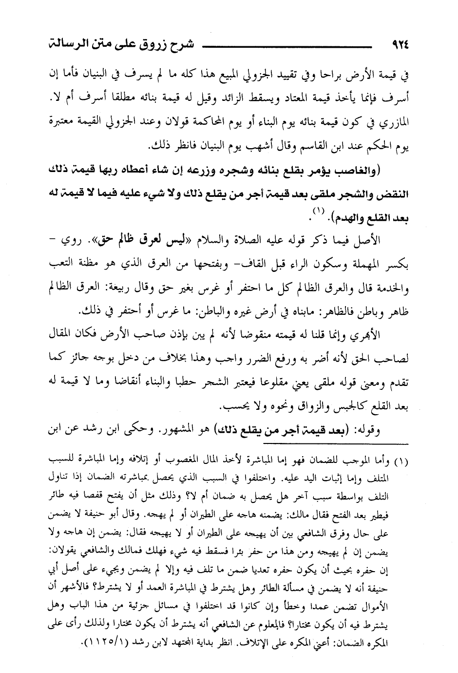 في قيمة الأرض براحا وفي تقييد الجزولي المبيع هذا كله ما لم يسرف في البنيان فأما إن أسرف فإنما يأخذ قيمة المعتاد ويسقط الزائد وقيل له قيمة بنائه مطلقا أسرف أم لا. المازري في كون قيمة بنائه يوم البناء أو يوم المحاكمة قولان وعند الجزولي القيمة معتبرة يوم الحكم عند ابن القاسم وقال أشهب يوم البنيان فانظر ذلك.