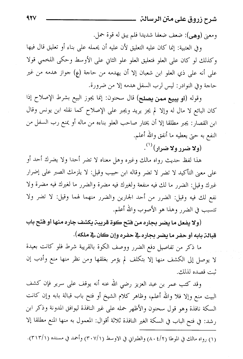 هذا لفظ حديث رواه مالك وغيره وهل معناه لا تضر أحد ولا يضرك أحد أو على معنى التأكيد لا تضر ولا تضر وقاله ابن حبيب وقيل: لا يلزمك الصبر على إضار غيرك وقيل: الضرر ما لك فيه منفعة ولغيرك فيه مضرة والضرر ما لغيرك فيه مضرة ولا نفع لك فيه وقيل: الضرر من أحد الجارين والضرر منهما لهما وقيل: لا تضر ولا تتسبت في الضرر هذا هو الأصوب والله أعلم.