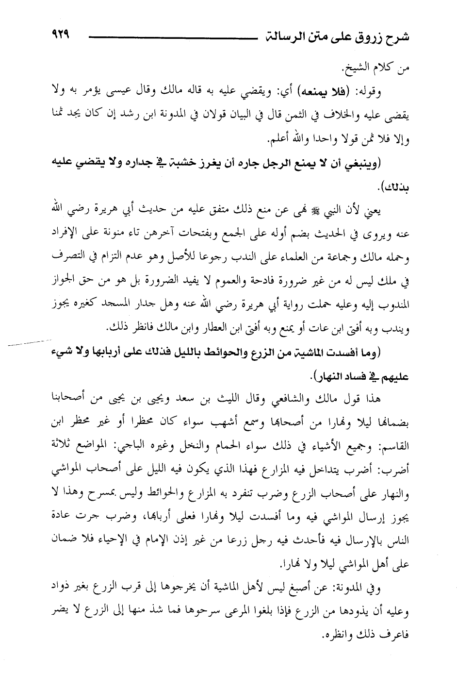وفي المدونة: عن أصبغ ليس لأهل الماشية أن يخرجوها إلى قرب الزرع بغير ذواد وعليه أن يذودها من الزرع فإذا بلغوا المرعى سرحوها ما شذ منها إلى الزرع لا يضر فاعرف ذلك وانظره.