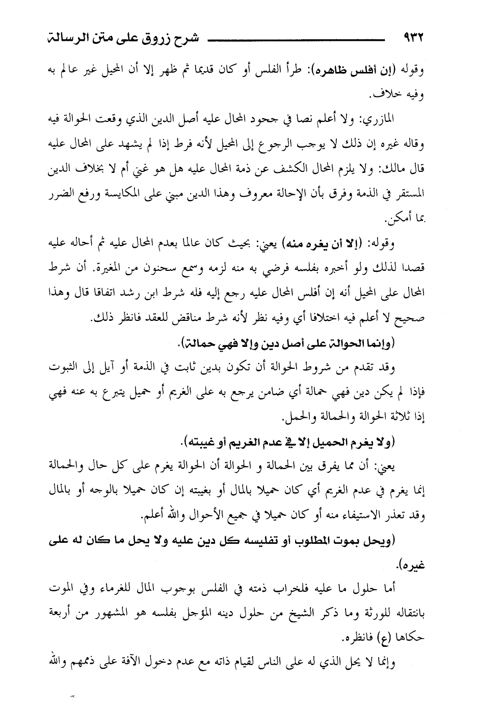 وقوله: (إلا أن يغره منه) يعني: بحيث كان عالما بعدم المحال عليه ثم أحاله عليه قصدا لذلك ولو أخبره بفلسه فرضي به منه لزمه وسمع سحنون من المغيرة. أن شرط المحال على المحيل أنه إن أفلس عليه رجع إليه فله شرط ابن رشد اتفاقا قال وهذا صحيح لا أعلم فيه اختلافا أي وفيه نظر لأنه شرط مناقض للعقد فانظر ذلك.