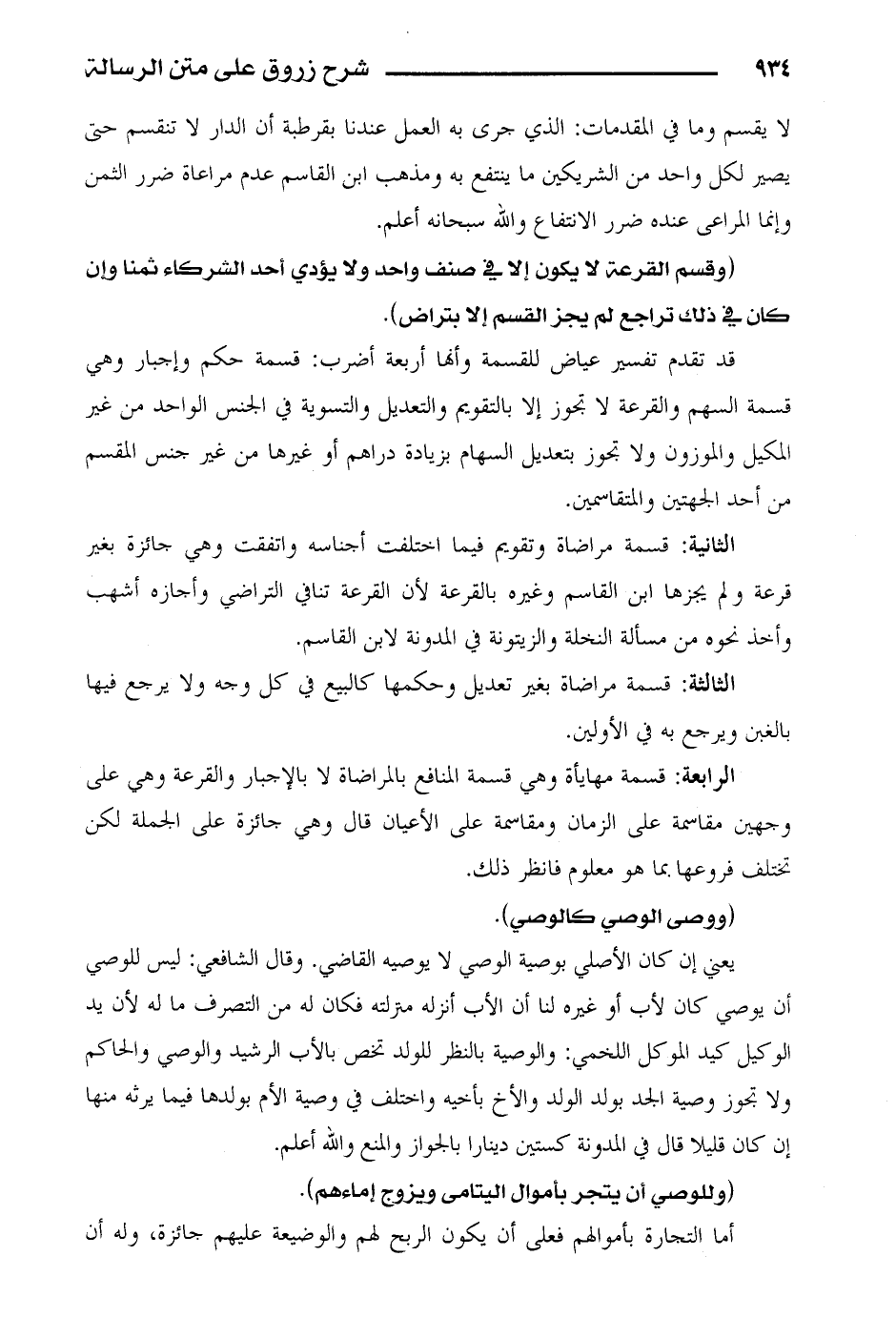 الرابعة: قسمة مهايأة وهي قسمة المنافع بالمراضاة لا بالإجبار والقرعة وهي على وجهين مقاسمة على الزمان ومقاسمة على الأعيان قال وهي جائزة على الجملة لكن تختلف فروعها بما هو معلوم فانظر ذلك.