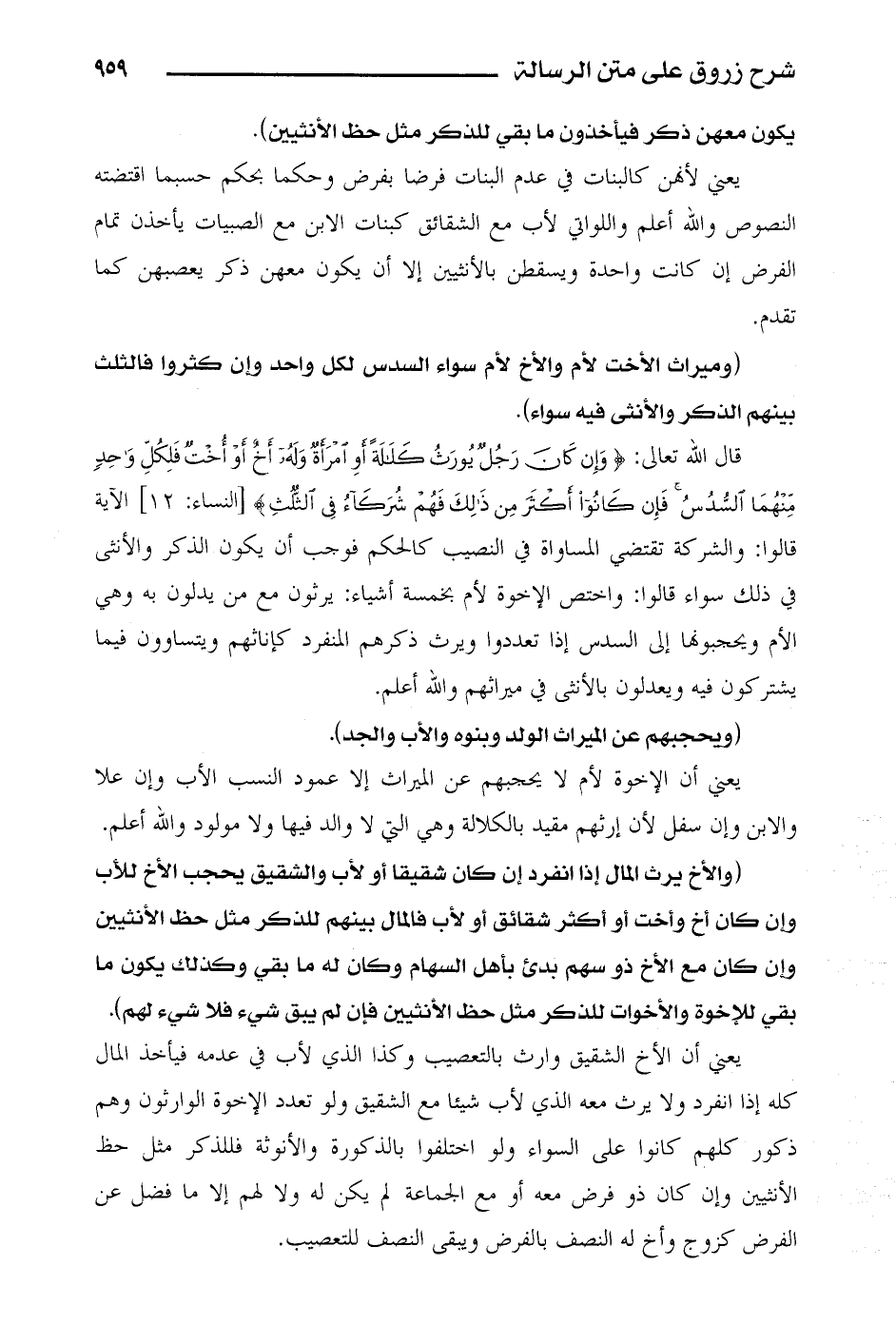 (والأخ يرث المال إذا انفرد إن كان شقيقا أو لأب والشقيق يحجب الأخ للأب وإن كان أخ وأخت أو أكثر شقائق أو لأب فالمال بينهم للذكر مثل حظ الأنثيين وإن كان مع الأخ ذو سهم بدئ بأهل السهام وكان له ما بقي وكذلك يكون ما بقي للإخوة والأخوات للذكر مثل حظ الأنثيين فإن لم يبق شيء فلا شيء لهم).