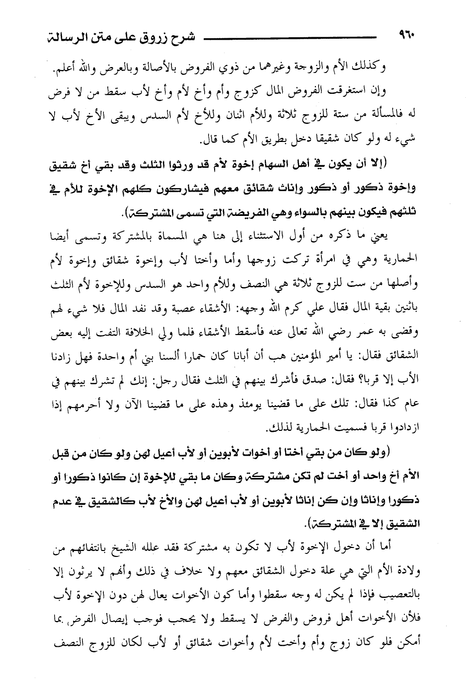 (إلا أن يكون في أهل السهام إخوة لأم قد ورثوا الثلث وقد بقي أخ شقيق وإخوة ذكور أو ذكرو وإناث شقائق معهم فيشاركون كلهم الإخوة للأم في ثلثهم فيكون بينهم بالسواء وهي الفريضة التي تسمى المشتركة).