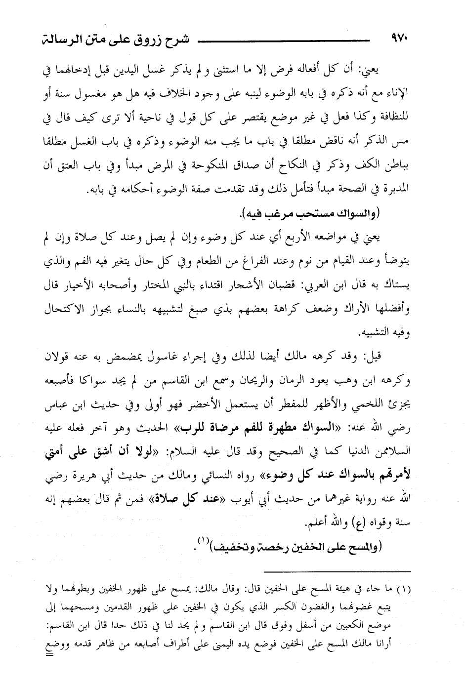 يعني في مواضعه الأربعة أي عند كل وضوء وإن لم يصل وعند كل صلاة وإن لم يتوضأ وعند القيام من نوم وعند الفراغ من الطعام وفي كل حال يتغير فيه الفم والذي يستاك به قال ابن العربي: قضبان الأشجار اقتداء بالنبي المختار وأصحابه الأخيار قال وأفضلها الأراك وضعف كراهة بعضهم بذي صبغ لتشبيهه بالنساء بجواز الاكتحال وفيه التشبيه.