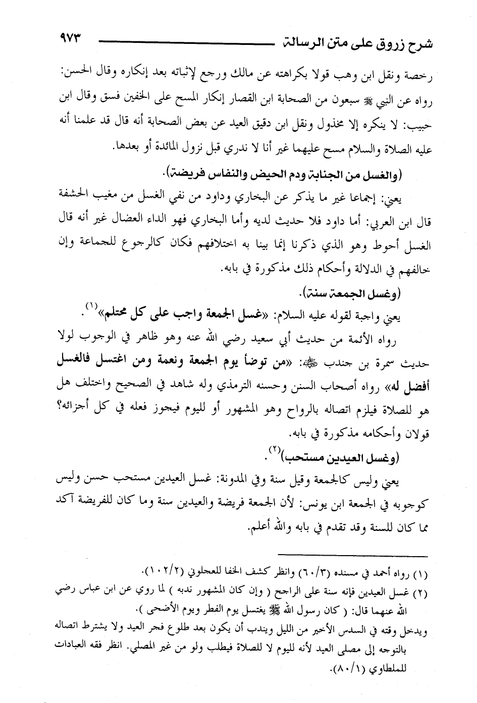 رواه الأئمة من حديث أبي سعيد رضي الله عنه وهو ظاهر في الوجوب لولا حديث سمرة بن جنبد رضي الله عنه: " من توضأ يوم الجمعة ونعمة ومن اغتسل فالغسل أفضل له" رواه أصحاب السنن وحسنه الترمذي وله شاهد في الصحيح واختلف هل هو للصلاة فيلزم اتصاله بالرواح وهو المشهور أو لليوم فيجوز فعله في كل أجزائه؟ قولان وأحكامه مذكورة في بابه.