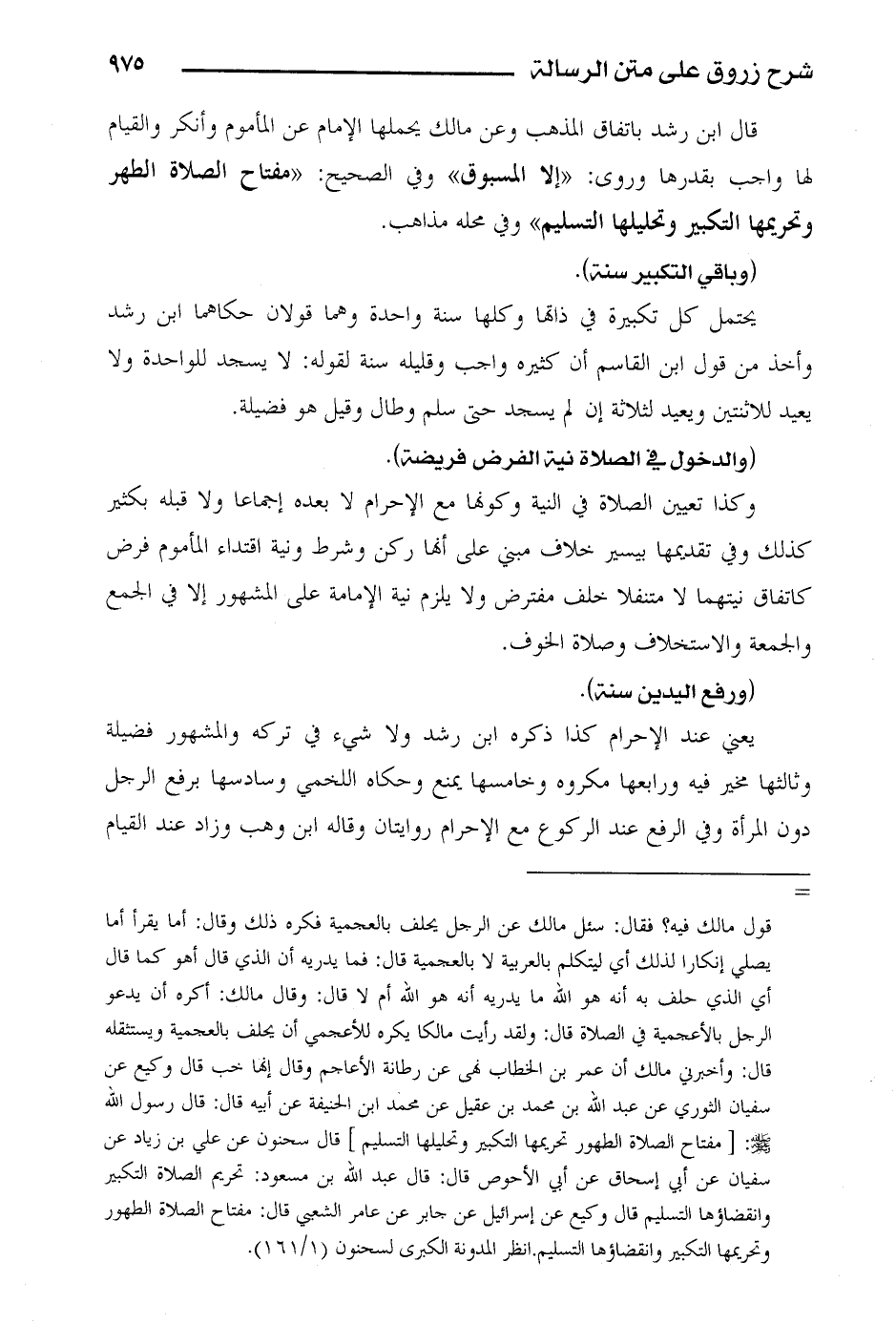 قال ابن رشد باتفاق المذهب وعن مالك يحملها الإمام عن المأموم وأنكر والقيام لها واجب بقدرها وروى: " إلا المسبوق" وفي الصحيح:" مفتاح الصلاة الطهر وتحريمها التكبير وتحليلها التسليم" وفي محله مذاهب.