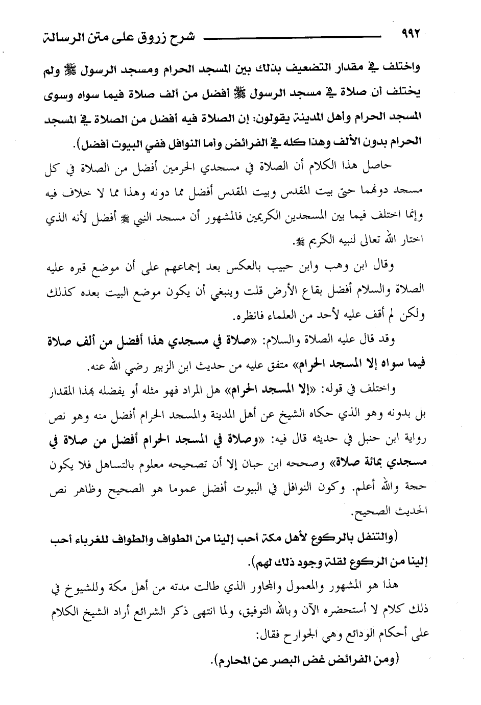 واختلف في مقدار التضعيف بذلك بين المسجد الحرام ومسجد الرسول صلى الله عليه وسلم لم يختلف أن صلاة في مسجد الرسول صلى الله عليه وسلم أفضل من ألف صلاة فيما سواه وسوى المسجد الحرام وأهل المدينة يقولون: إن الصلاة فيه أفضل من الصلاة في المسجد الحرام بدون الألف هذا كله في الفرائض وأما النوافل ففي البيوت أفضل).