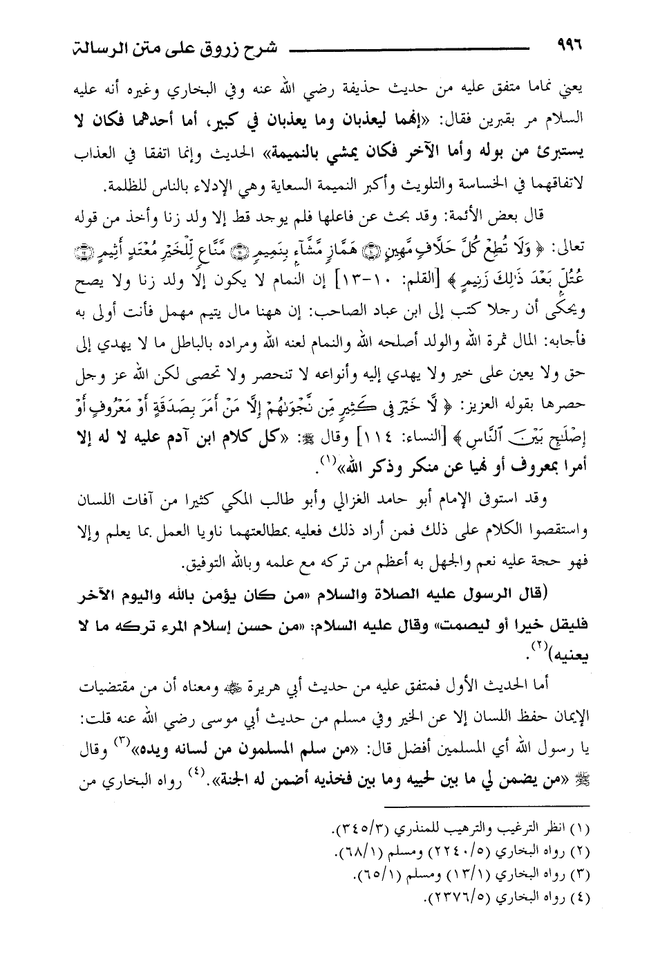 قال بعض الأئمة: وقد بحث عن فاعلها فلم يوجد قط إلا ولد زنا وأخذ من قوله تعالى: {ولا تطع كل حلاف مهين (10) هماز مشاء بنميم (11) مناع للخير معتد أثيم (12) عتل بعد ذلك زنيم} [القلم: 10 - 13] إن النمام لا يكون إلا ولد زنا ولا يصح ويحكى أن رجلا كتب إلى ابن عباد الصاحب: إن ههنا مال يتيم مهمل فأنت أولى به فأجابه: المال ثمرة الله والولد أصلحه الله والنمام لعنه الله ومراده بالباطل ما لا يهدي إلى حق ولا يعين على خير ولا يهدي إليه وأنواعه لا تنتحصر ولا تحصى لكن الله عز وجل حصرها بقوله العزيز: {لا خير في كثير من نجواهم إلا من أمر بصدقة أو معروف أو إصلاح بين الناس} [النساء: 114] وقال صلى الله عليه وسلم: " كل كلام ابن آدم عليه لا له إلا أمرا بمعروف أو نهيا عن منكر وذكر الله".