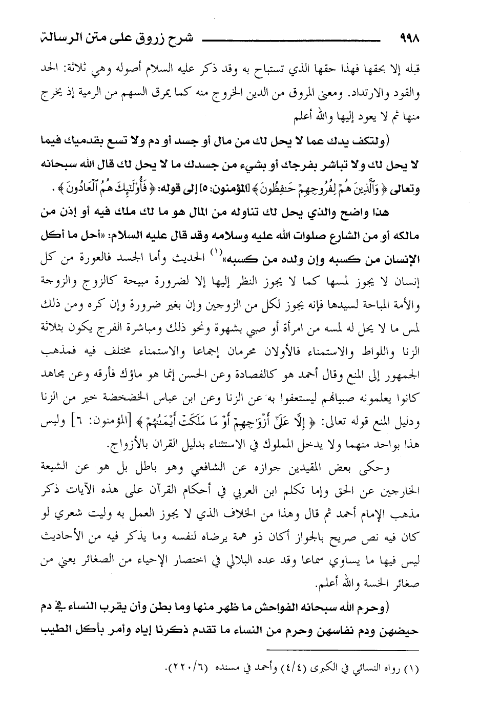 (ولتكف يدك عما لا يحل لك من مال أو جسد أو دم ولا تسع بقدميك فيما لا يحل لك ولا تباشر بفرجك أو بشيء من جسدك ما لا يحل لك قال الله سبحانه وتعالى {والذين هم لفروجهم حافظون} [المؤمنون: 5] إلى قوله: {فأولئك هم العادون}.