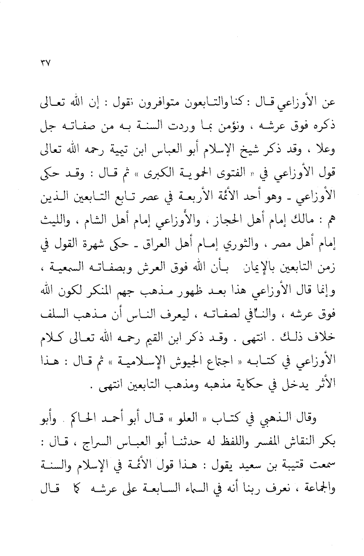 عن الأوزاعي، قال: كنَّا والتابعون مُتوافرون نقول: إنَّ الله - تعالى ذكره - فوق عرشه، ونؤمن بما وردت السنة به من صفاته - جل وعلا - وقد ذكر شيخ الإسلام أبو العباس ابن تيمية - رحمه الله تعالى - قول الأوزاعي في "الفتوى الحموية الكبرى"، ثم قال: وقد حكى الأوزاعي وهو أحد الأئمة الأربعة في عصر تابع التَّابعين الذين هم: مالك إمام أهل الحجاز، والأوزاعي إمام أهل الشام، والليث إمام أهل مصر، والثوري إمام أهل العراق، حكى شهرة القول في زمن التابعين بالإيمان بأن الله فوق العَرش وبصفاته السمعية، وإنَّما قال الأوزاعي هذا بعد ظهور مَذهب جهم المنكر لكون الله فوق عرشه، والنَّافي لصفاته؛ ليعرفَ الناس أنَّ مذهب السلف خلاف ذلك؛ انتهى، وقد ذكر ابن القيم - رحمه الله تعالى - كلام الأوزاعي في كتابه "اجتماع الجيوش الإسلامية"، ثم قال: هذا الأثر يدخل في حكاية مذهبه ومذهب التابعين؛ انتهى.