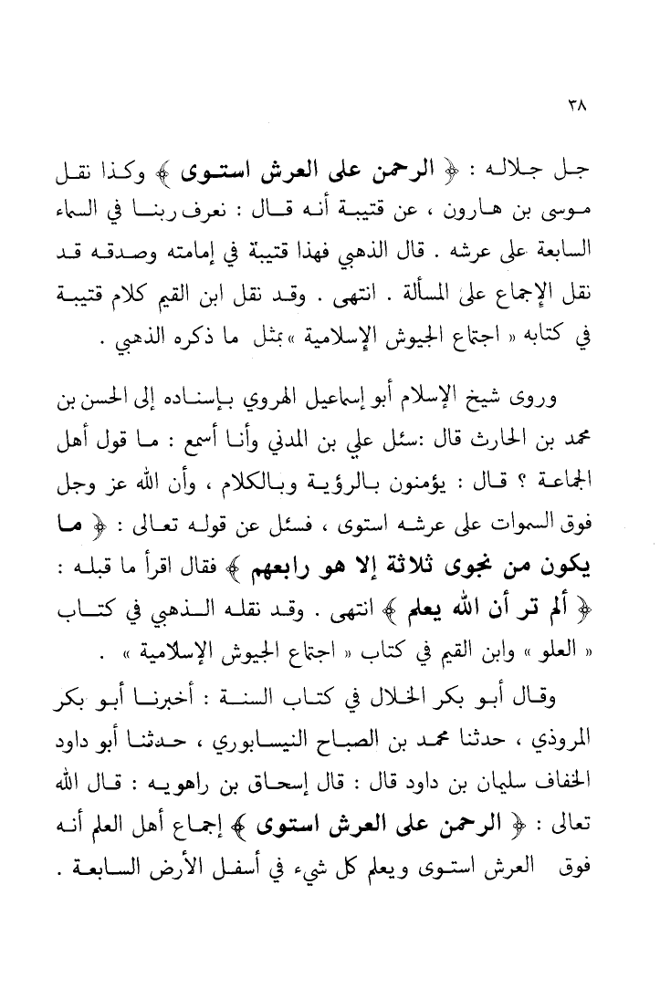 - جل جلاله -: {الرَّحْمَنُ عَلَى الْعَرْشِ اسْتَوَى} [طه: 5]، وكذا نقل موسى بن هارون، عن قتيبة أنَّه قال: نعرف ربنا في السماء السابعة على عرشه، قال الذهبي: فهذا قتيبة في إمامته وصدقه قد نقل الإجماع على المسألة؛ انتهى، وقد نقل ابن القيم كلام قتيبة في كتابه "اجتماع الجيوش الإسلامية" بمثل ما ذكره الذهبي.