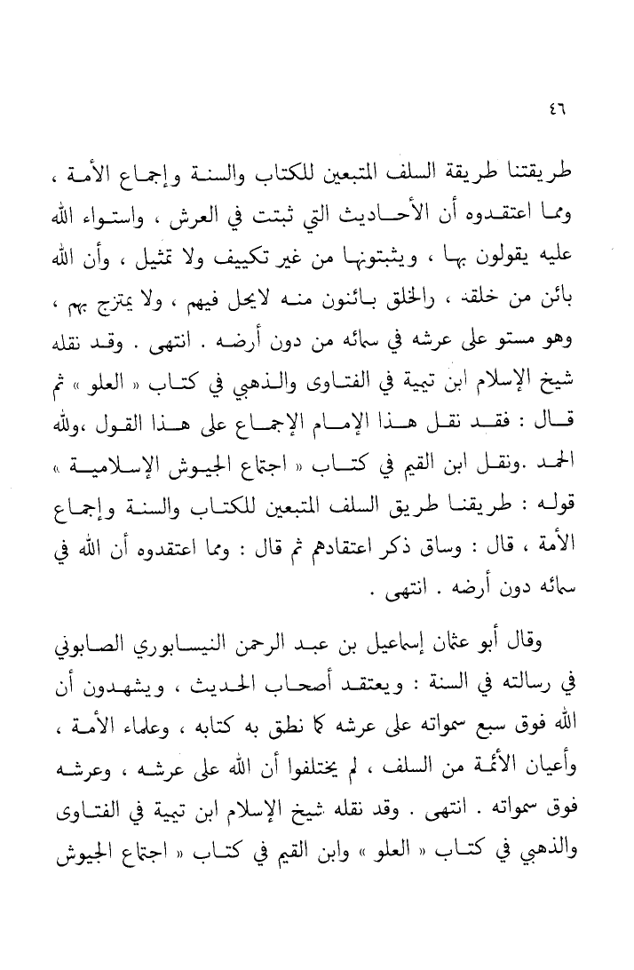 وقال أبو عثمان إسماعيل بن عبدالرحمن النيسابوري الصابوني في رسالته في السنة: ويعتقد أصحاب الحديث، ويشهدون أنَّ الله فوق سبع سمواته على عرشه، كما نطق به كتابه، وعلماء الأمة، وأعيان الأئمة من السَّلف، لم يختلفوا أنَّ الله على عرشه، وعرشه فوق سمواته؛ انتهى، وقد نقله شيخُ الإسلام ابن تيمية في "الفتاوى"، والذهبي في كتاب "العلو"، وابن القيم في كتاب "اجتماع الجيوش