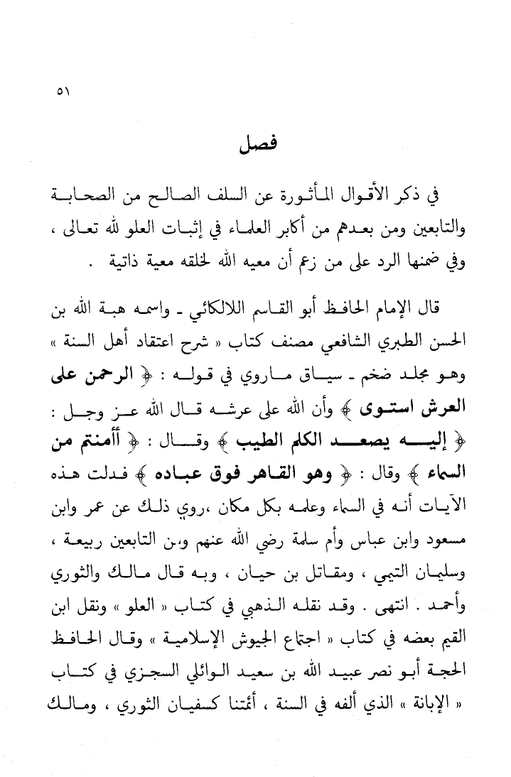 قال الإمام الحافظ أبو القاسم اللالكائي - واسمه هبة الله بن الحسن الطبري الشافعي، مصنف كتاب "شرح اعتقاد أهل السنة"، وهو مجلد فخم -: سياق ما روي في قوله: {الرَّحْمَنُ عَلَى الْعَرْشِ اسْتَوَى} [طه: 5]، وأنَّ الله على عرشه؛ قال الله - عزَّ وجلَّ -: {إِلَيْهِ يَصْعَدُ الْكَلِمُ الطَّيِّبُ} [فاطر: 10]، وقال: {أَأَمِنْتُمْ مَنْ فِي السَّمَاءِ} [الملك: 16]، وقال: {وَهُوَ الْقَاهِرُ فَوْقَ عِبَادِهِ} [الأنعام: 18]، فدلَّت هذه الآيات أنَّه في السماء وعلمه بكلِّ مكان، روي ذلك عن عمر وابن مسعود وابن عباس وأم سلمة - رضي الله عنهم - ومن التابعين ربيعة، وسليمان التيمي، ومقاتل بن حيان، وبه قال مالك والثوري وأحمد؛ انتهى، وقد نقله الذهبي في كتاب "العلو"، ونقل ابن القيم بعضه في كتاب "اجتماع الجيوش الإسلامية"، وقال الحافظ الحجة أبو نصر عبيد الله بن سعيد الوائلي السجزي في كتاب "الإبانة"، الذي ألفه في السنة، أئمتنا كسفيان الثوري، ومالك،