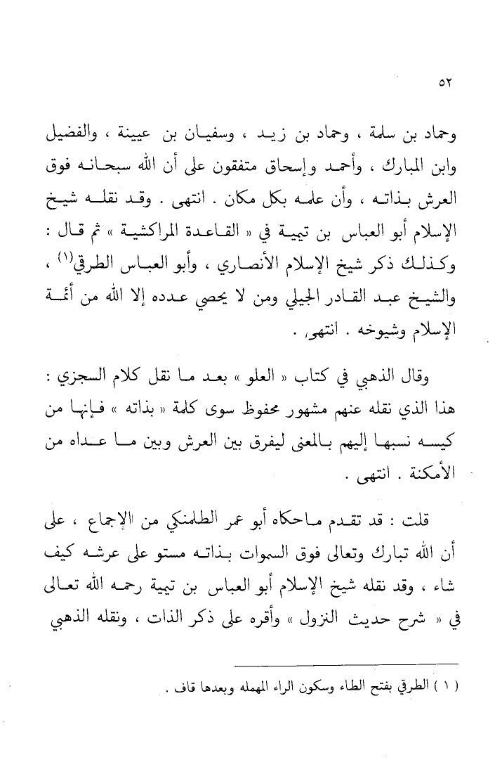 وحماد بن سلمة، وحماد بن زيد، وسفيان بن عيينة، والفضيل، وابن المبارك، وأحمد، وإسحاق متفقون على أن الله - سبحانه - فوق العرش بذاته، وأنَّ علمه بكل مكان؛ انتهى، وقد نقله شيخُ الإسلام أبو العباس ابن تيميَّة في "القاعدة المراكشية"، ثم قال: وكذلك ذكر شيخ الإسلام الأنصاري، وأبو العباس الطَّرْقي (¬1)، والشيخ عبدالقادر الجيلاني، ومن لا يُحصِي عددَه إلا اللهُ من أئمة الإسلام وشيوخه؛ انتهى.