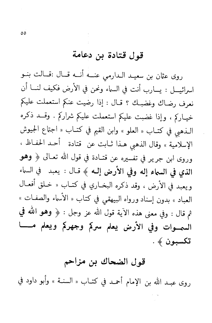 روى عثمان بن سعيد الدارمي عنه أنَّه قال: قالت بنو إسرائيل: يا رب، أنت في السماء ونحن في الأرض، فكيف لنا أنْ نعرفَ رضاك وغضبَك؟ قال: إذا رضيت عنكم، استعملت عليكم خيارَكم، وإذا غضبت عليكم، استعملت عليكم شرارَكم، وقد ذكره الذهبي في كتاب "العلو" وابن القيم في كتاب "اجتماع الجيوش الإسلامية"، وقال الذهبي هذا ثابت عن قتادة أحد الحفاظ، وروى ابن جرير في تفسيره عن قتادة في قول الله - تعالى -: {وَهُوَ الَّذِي فِي السَّمَاءِ إِلَهٌ وَفِي الْأَرْضِ إِلَهٌ} [الزخرف: 84]، قال: يعبد في السماء، ويعبد في الأرض، وقد ذكره البخاري في كتاب "خلق أفعال العباد" من دون إسناد، ورواه البيهقي في كتاب "الأسماء والصفات"، ثم قال: وفي معنى هذه الآية قول الله - عزَّ وجلَّ -: {وَهُوَ اللَّهُ فِي السَّمَوَاتِ وَفِي الْأَرْضِ يَعْلَمُ سِرَّكُمْ وَجَهْرَكُمْ وَيَعْلَمُ مَا تَكْسِبُونَ} [الأنعام: 3].