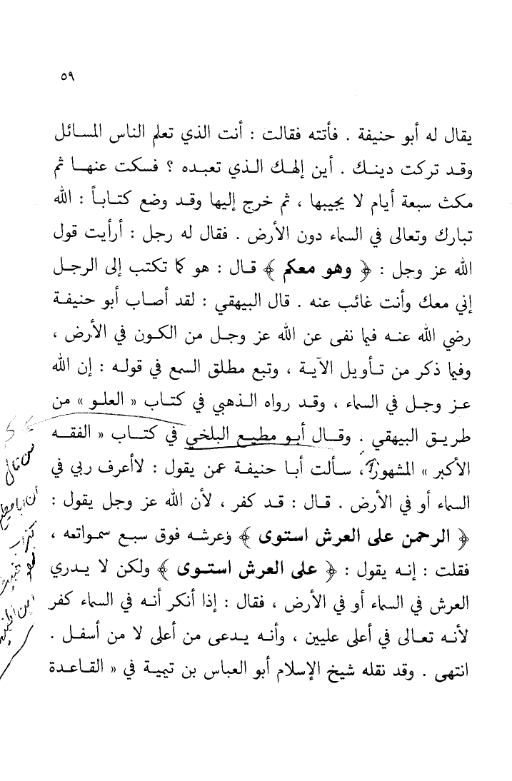 قال البيهقي: لقد أصاب أبو حنيفة - رضي الله عنه - فيما نفى عن الله - عزَّ وجلَّ - من الكون في الأرض، وفيما ذَكَر من تأويل الآية، وتَبِعَ مُطلقَ السمع في قوله: إنَّ الله - عزَّ وجلَّ - في السماء، وقد رواه الذَّهبي في كتاب "العلو" من طريق البيهقي، وقال أبو مطيع البلخي في كتاب "الفقه الأكبر" المشهور، سألت أبا حنيفة عمَّن يقول: لا أعرف ربِّي في السماء أو في الأرض، قال: قد كفر؛ لأنَّ الله - عزَّ وجلَّ - يقول: {الرَّحْمَنُ عَلَى الْعَرْشِ اسْتَوَى} [طه: 5]، وعرشه فوق سبع سموات، فقلت: إنَّه يقول: {عَلَى الْعَرْشِ اسْتَوَى} [طه: 5]، ولكن لا يدري العرش في السماء أو في الأرض، فقال: إذا أنكر أنَّه في السماء، كفر؛ لأنَّه تعالى في أعلى علِّيِّين، وأنه يُدعى من أعلى لا من أسفل؛ انتهى، وقد نقله شيخ الإسلام أبو العباس ابن تيميَّة في "القاعدة