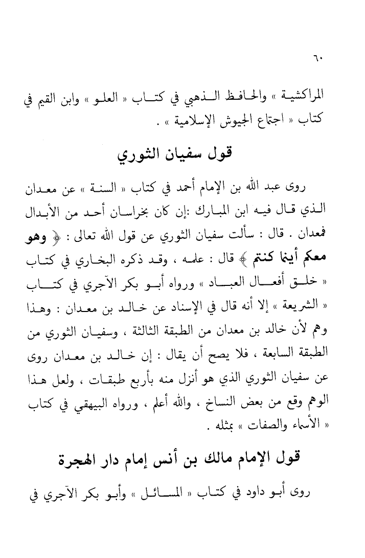 روى عبدالله ابن الإمام أحمد في كتاب "السنة" عن معدان الذي قال فيه ابن المبارك: إنْ كان بخراسان أحد من الأبدال فمعدان، قال: سألت سفيان الثوري عن قول الله - تعالى -: {وَهُوَ مَعَكُمْ أَيْنَ مَا كُنْتُمْ} [الحديد: 4]، قال: علمه، وقد ذكره البخاري في كتاب "خلق أفعال العباد"، ورواه أبو بكر الآجُرِّي في كتاب "الشريعة"، إلاَّ أنه قال في الإسناد عن خالد بن معدان: وهذا وَهْمٌ؛ لأنَّ خالدَ بن معدان من الطبقة الثالثة، وسفيان الثوري من الطبقة السابعة، فلا يصح أنْ يقالَ: إنَّ خالد بن معدان روى عن سفيان الثَّوري الذي هو أنزل منه بأربع طبقات، ولعلَّ هذا الوهم وقع من بعض النُّسَّاخ، والله أعلم، ورواه البيهقي في كتاب "الأسماء والصفات" بمثله.