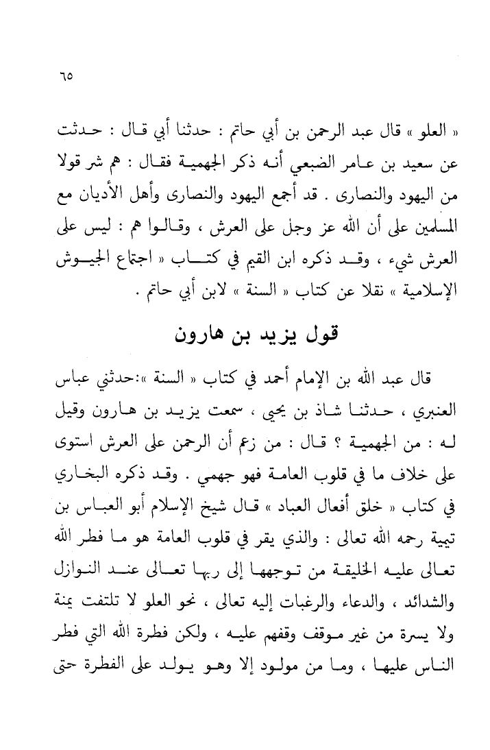 قال عبدالله ابن الإمام أحمد في كتاب "السنة": حدثني عباس العنبري، حدثنا شاذ بن يحيى، سمعت يزيد بن هارون وقيل له: من الجهمية؟ قال: من زعم أنَّ الرحمن على العرش استوى على خلاف ما في قلوب العامَّة، فهو جهمي، وقد ذكره البخاري في كتاب "خلق أفعال العباد"، قال شيخ الإسلام أبو العباس ابن تيمية - رحمه الله تعالى -: والذي يقر في قلوب العامة هو ما فطر الله - تعالى - عليه الخليقة من توجُّهِها إلى ربِّها - تعالى - عند النَّوازل والشَّدائد، والدُّعاء والرغبات إليه - تعالى - نحو العلو لا تلتفت يَمنَةً ولا يَسْرَةً من غير موقف وقفهم عليه، ولكن فطرة الله التي فطر الناس عليها، وما من مولود إلا وهو يولد على الفطرة حتى
