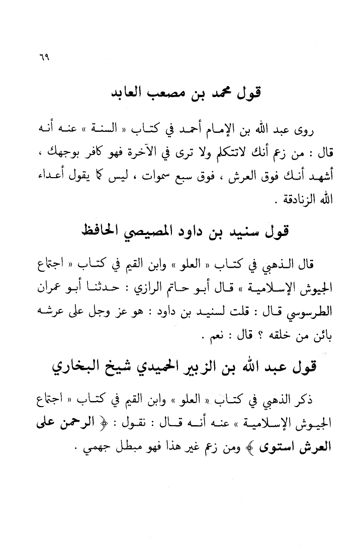 ذكر الذهبي في كتاب "العلو" وابن القيم في كتاب "اجتماع الجيوش الإسلامية" عنه أنه قال: نقول: {الرَّحْمَنُ عَلَى الْعَرْشِ اسْتَوَى} [طه: 5]، ومن زعم غير هذا، فهو مبطل جهمي.