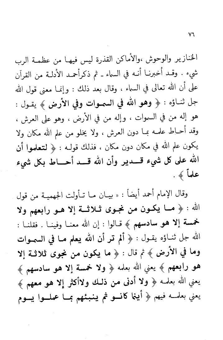 وقال الإمام أحمد أيضًا: "بيان ما تأولت الجهميَّة من قول الله: {مَا يَكُونُ مِنْ نَجْوَى ثَلَاثَةٍ إِلَّا هُوَ رَابِعُهُمْ وَلَا خَمْسَةٍ إِلَّا هُوَ سَادِسُهُمْ} [المجادلة: 7]، قالوا: إنَّ الله معنا وفينا، فقلنا: الله - جل ثناؤه - يقول: {أَلَمْ تَرَ أَنَّ اللَّهَ يَعْلَمُ مَا فِي السَّمَاوَاتِ وَمَا فِي الْأَرْضِ} [المجادلة: 7]، ثم قال: {مَا يَكُونُ مِنْ نَجْوَى ثَلَاثَةٍ إِلَّا هُوَ رَابِعُهُمْ} [المجادلة: 7]؛ يعني: الله بعلمه، {وَلَا خَمْسَةٍ إِلَّا هُوَ سَادِسُهُمْ} [المجادلة: 7]، يعني الله بعلمه، {وَلَا أَدْنَى مِنْ ذَلِكَ وَلَا أَكْثَرَ إِلَّا هُوَ مَعَهُمْ} [المجادلة: 7]؛ يعني: بعلمه فيهم، {أَيْنَ مَا كَانُوا ثُمَّ يُنَبِّئُهُمْ بِمَا عَمِلُوا يَوْمَ